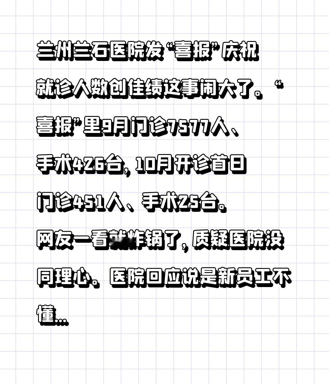 兰州兰石医院发“喜报”庆祝就诊人数创佳绩这事闹大了。“喜报”里9月门诊7577人