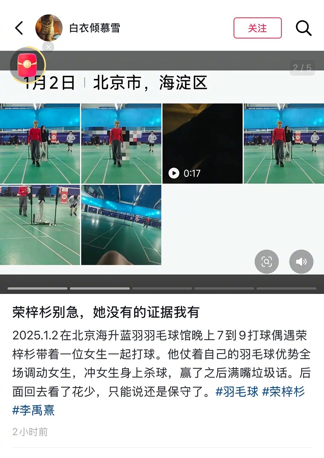 李禹熹锤荣梓杉的文里提到1月2日一起打羽毛球。小红薯上那天有人看见了还拍照了