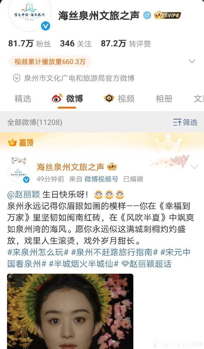 泉州文旅发文为赵丽颖庆生赵丽颖和泉州这波联动堪称典范!她让 “头顶花园” 的蟳埔女文化走向大众,泉州用置顶庆生这份仪式感回应,“今生簪花,世世漂亮” 的符号背后全是文化与流量的完美契合。 泉州文旅为赵丽颖庆生