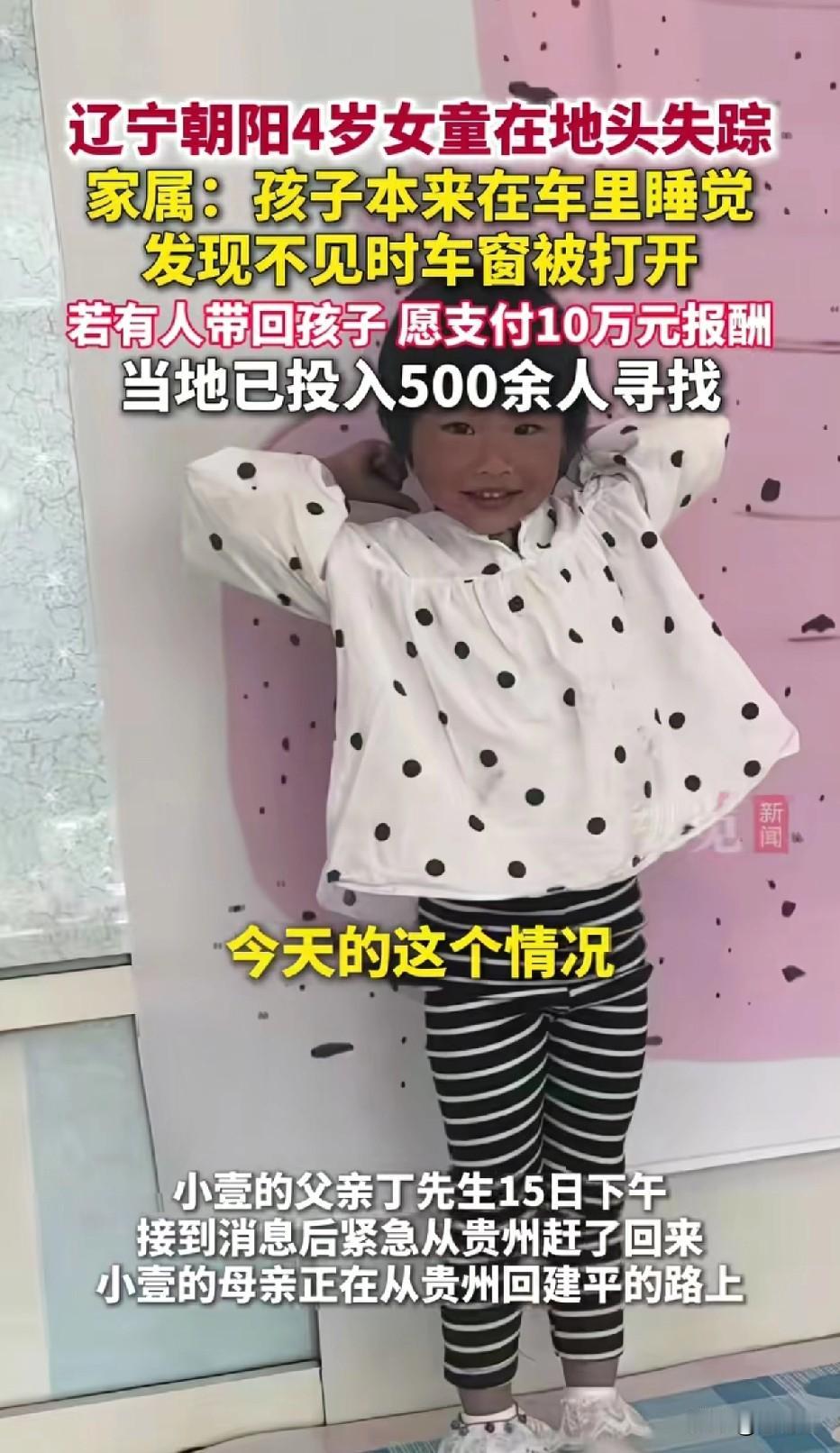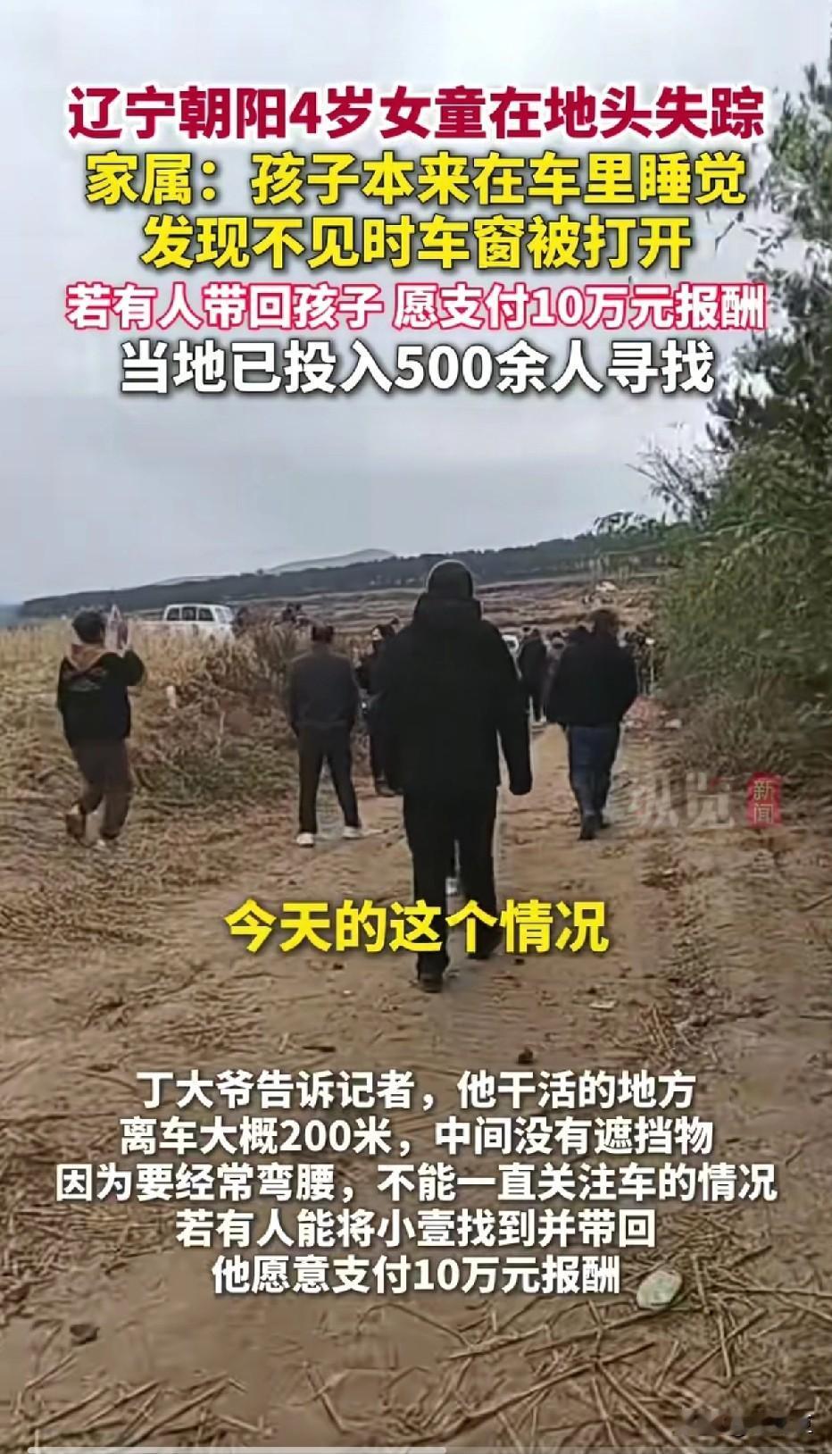 悬赏10万找孩子! 真揪心!爷爷奶奶在地里干活,孩子在车上睡觉,不到20分钟,孩子不见了! 10月15号,辽宁一4岁的女孩在车上睡觉,当时爷爷奶奶要去地里干活,想着孩子在睡觉,干活也在附近。就把窗户打开了一条缝,把孩子一个人锁在面包车里睡觉。 结果短短不到半小时,爷爷奶奶回来发现孩子不见了。车窗也从一条透气的缝变成了半开,孩子凭空消失在辽宁建平的丘陵田间 。 随后家长报警,并发动上500人搜了一整夜,无人机和搜救犬都出动了,也没有发现孩子的身影。 家属急得拿出10万悬赏,爸爸从南方连夜赶回来,连孩子妈妈都还没敢告知这个消息,怕她撑不住 。 有网友怀疑两种情况: 1、孩子醒了,出去找爷爷奶奶,自己走丢了。 建议去沟里,河里,草堆等,比较隐蔽的地方去查查。 2、被人抱走了。 建议把村子给封了,挨家挨户去搜查,地窖,水井,密室等等的地方,都得去查查。 这家人心里该有多着急啊,希望孩子能够早点找到! 大家觉得这么大的孩子,是走丢的可能性大,还是被坏人抱走的可能性大呢?