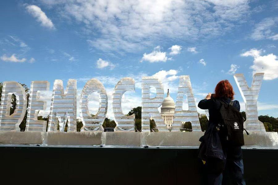 4、一座刻着“民主”字样的冰雕被放置在美国国会大厦正对面的国家广场上