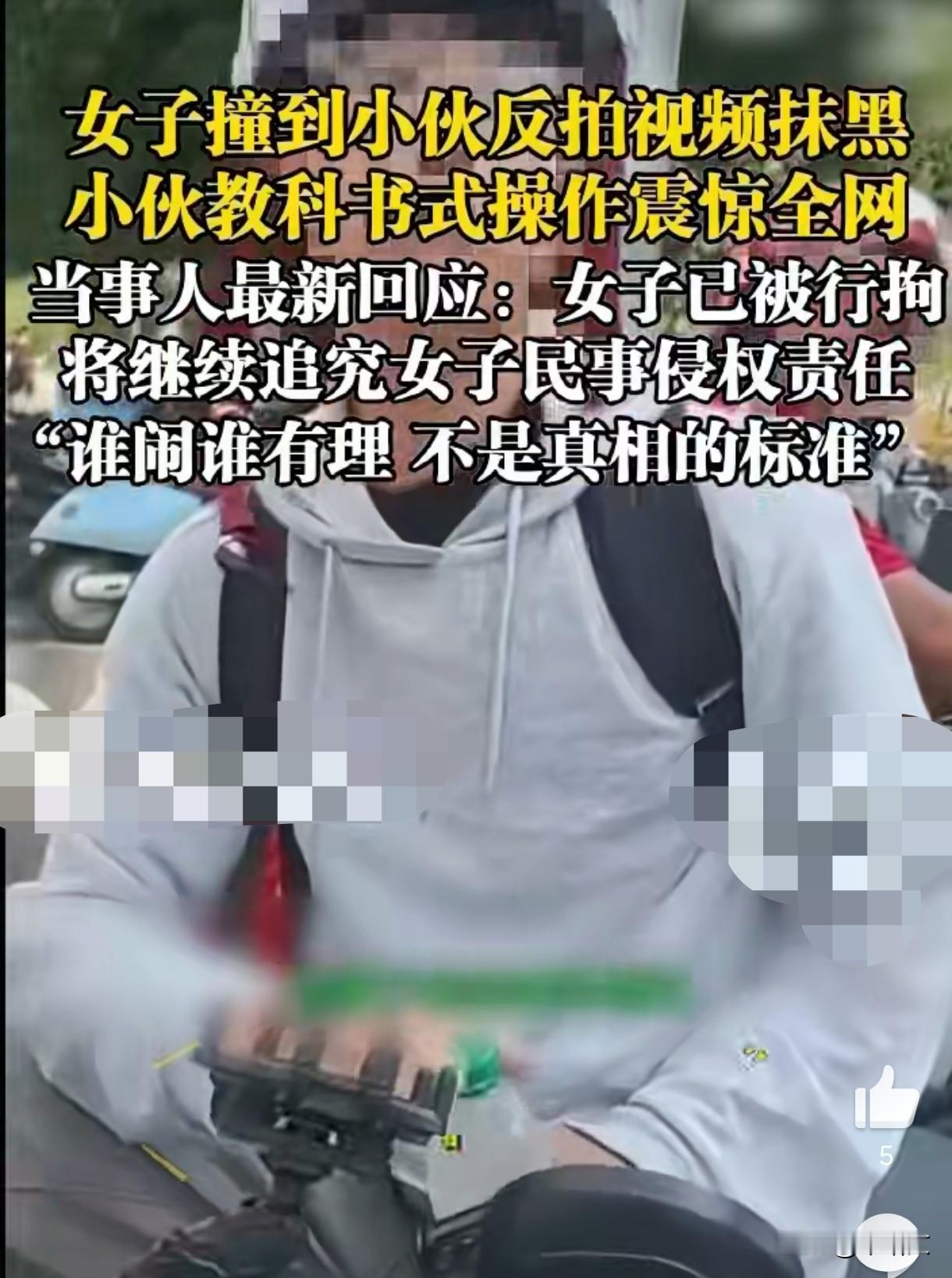 女子撞人反拍视频抹黑!小伙一句“听交警的”让她行拘,太解气 江苏苏州这事儿看得人拍手称快!女子逆行撞了小伙,反倒举着手机拍视频抹黑,结果小伙一招制敌,现在女子被行拘,还得赔损失,这操作太漂亮了。 事情得从8月4号说起,小伙正常骑车,突然被个逆行的女子撞上,俩人车都蹭了下。没等小伙说话,女子直接掏出手机开拍,上来就放狠话质问。 女子连着抛了五个问题,又是问“撞了人还揍人吗”,又是骂“你咋活到现在的”,句句带刺,摆明了想设套让小伙掉进话柄,看着都让人替小伙捏把汗。 谁成想小伙压根不上当,不管女子咋咋呼呼,就一句话来回说:“我听交警的”。不吵不闹不接茬,全程冷静得不像当事人,这定力也是没谁了。 交警赶来一看现场,立马就定了责:女子逆行,全责。女子当面没说啥,答应去交警队处理,结果半道上趁人不注意,直接溜了,这波操作也是够鸡贼的。 本以为这事儿就这么结了,没想到女子转头就把剪辑过的视频发上网了。关键是视频里没给小伙打码,脸和手机号全露着,明摆着要引导网友网暴他。 小伙这下遭了罪,网友不明真相跟着骂,电话也被打爆了,正常生活全被搅乱。但他没慌,8月14号直接报警,拿着证据走法律程序,一点不含糊。 这事儿在网上发酵了俩月,10月中旬终于有了结果。小伙晒出行政处罚决定书,女子因为歪曲事实、侮辱人、发侵权视频,直接被行政拘留了,真是大快人心。 更解气的是,小伙说了,这还不算完,已经找了律师,要追究女子的民事责任,肖像权、名誉权、隐私权的账,得一笔一笔算清楚。 他还特意强调,“谁闹谁有理,不是真相的标准”。这话太在理了,要是换个人被女子一激就吵起来,说不定真得吃哑巴亏,哪能有这痛快结局。 有网友说这是教科书式维权,全程踩在点子上:不跟对方掰扯,等交警定责,保留证据报警,该追责时绝不手软,简直是普通人维权的范本。 其实以前也有类似的事儿,有人出事就拿手机拍视频带节奏,想靠闹大占便宜。但这次女子栽了,也给这些人提了醒,法律可不看谁嗓门大。 苏州警方这波处理也挺硬气,没和稀泥,照着证据和法规来,直接拘留加追责,让大家看到法律是真能给讲道理的人撑腰的。 现在女子为自己的作妖付出了代价,不光被拘留,还得赔钱道歉。你说这事儿是不是给那些想颠倒黑白的人敲了警钟?以后再想靠抹黑他人逃责任,可行不通了吧?