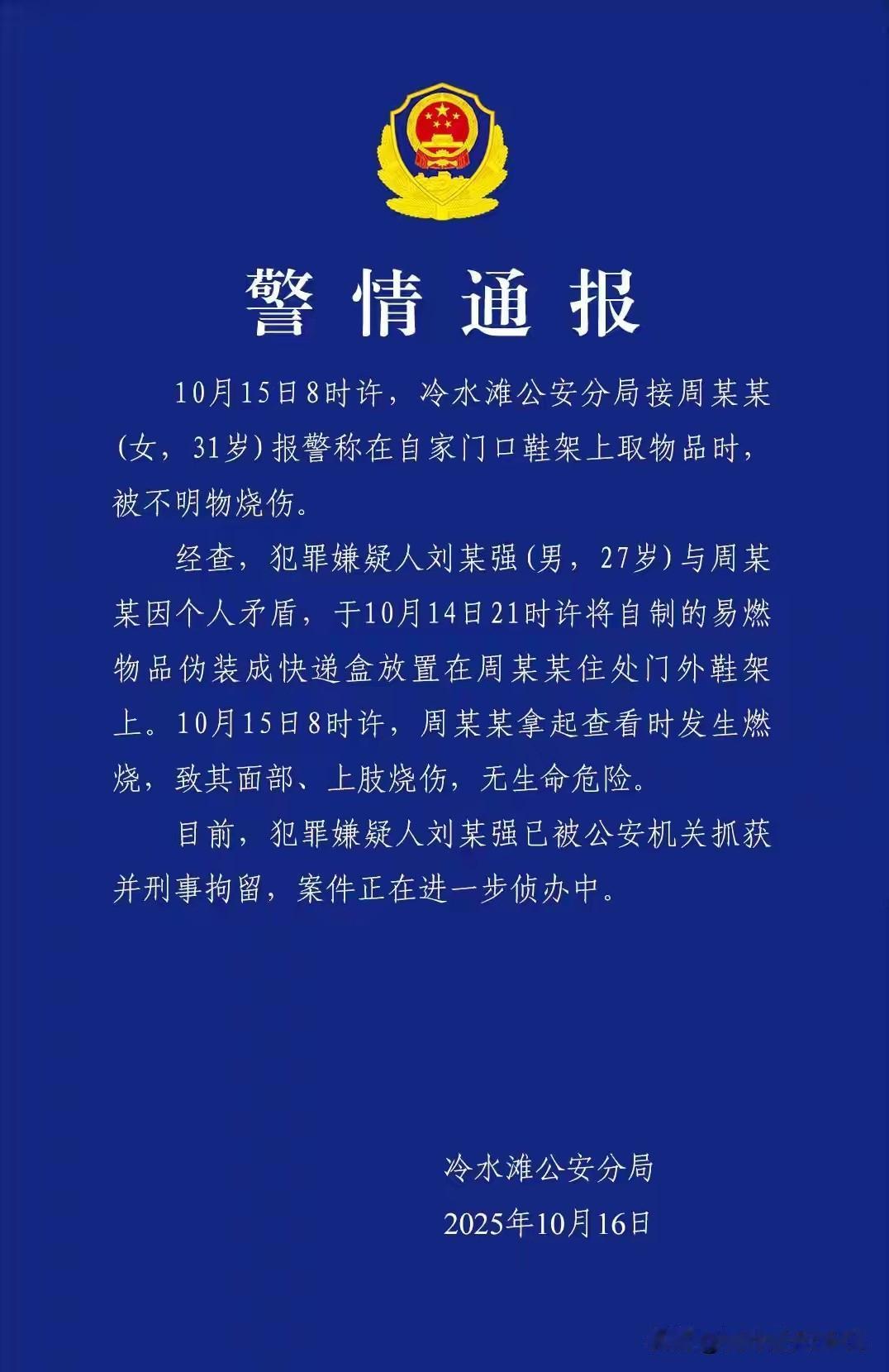 有网友说:有这手艺月入五万不难,他为何偏要用来制作一个复仇“快递”? 这两天,湖南冷水滩警方的一份通报引发关注。10月15日早上8点多,31岁的周女士在自家门口鞋架上取东西时,突然被不明物体烧伤。警方调查后迅速破案——27岁的刘某强因为与周女士有“个人矛盾”,竟然自制了易燃物品,伪装成快递盒放在她家门口。周女士第二天早上拿起查看时,物品突然燃烧,导致她面部和上肢烧伤,所幸没有生命危险。目前刘某强已被刑事拘留。 看完这个通报,很多人背后发凉。现在收快递已经成了生活日常,谁能想到门口普普通通的快递盒会突然起火伤人? 矛盾背后,究竟藏着什么? 通报里说得简单——“因个人矛盾”。但什么样的矛盾,能让一个人下如此狠手?这可不是简单的恶作剧或小小教训,这是把人往死里整啊。 有网友猜测,是不是情感纠纷?或是邻里矛盾激化?也可能是经济纠纷?我们不是当事人,不好妄加揣测。但无论什么矛盾,用这种极端方式解决,不仅毁了别人,也毁了自己。 “高手在民间”?可惜用错了地方 还有网友注意到一个细节:刘某强自制了易燃物品。有人开玩笑说,“这年头,能自制易燃物品也是个人才了”、“有这手艺,随便找个相关工作月入五万起步,何苦呢”。 话虽调侃,但理不糙。一个人有能力、有创意本来是好事,但用错了地方,就成了灾难。就像刘某强,原本可能是个动手能力强的聪明人,却因为钻牛角尖,把聪明才智用在了违法害人上,最终把自己送进了监狱。 一时冲动,两败俱伤 从警方通报的时间线看,刘某强是10月14日晚上9点多放置的易燃物,到第二天早上8点多事发,这中间有整整十多个小时。这么长的时间里,他完全有机会冷静下来,回去把东西拿走,避免悲剧发生。但他没有。 结果呢?周女士被烧伤,虽然无生命危险,但面部和上肢烧伤,这痛苦和后续的治疗恢复不言而喻,可能还会留下永久性伤痕。而刘某强自己,因为一时冲动,面临的将是法律的严惩。 解决问题,永远有比极端方式更好的选择 生活中,我们难免会与人发生矛盾。但解决矛盾的方式有很多种——沟通、调解、法律途径……无论如何,都不应该选择伤害他人身体的方式。 有时候,我们可能就是一时之气,觉得非要“给对方点颜色看看”。但冷静下来想想,真的值得吗?为了一时之气,毁掉两个家庭,毁掉自己的人生? 这起“快递盒烧伤案”给我们敲响了警钟:遇到矛盾,冷静沟通才是正道;动手能力强是好事,但一定要用在正道上;任何时候,都不要让冲动战胜理智。 希望周女士早日康复。这个放在家门口的“快递盒”,烧伤的是一个人,警示的却是我们所有人:怒火中烧时,千万别让那根理智的引线也被点燃。 人生感悟 爆料 分享今日的感悟 注:取材网络,如有侵权和不实之处,敬请联系删除