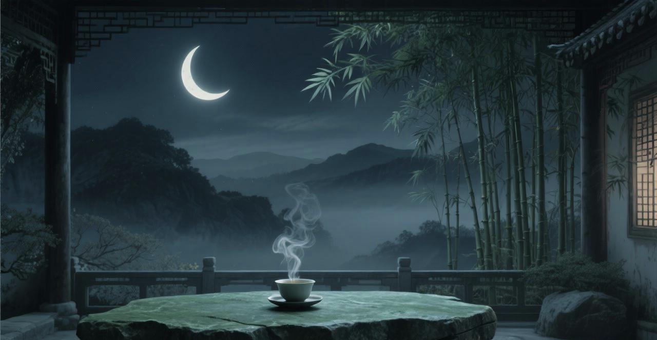 下联:半杯茶品人生,诚邀上联?上联:一弯月钓往事