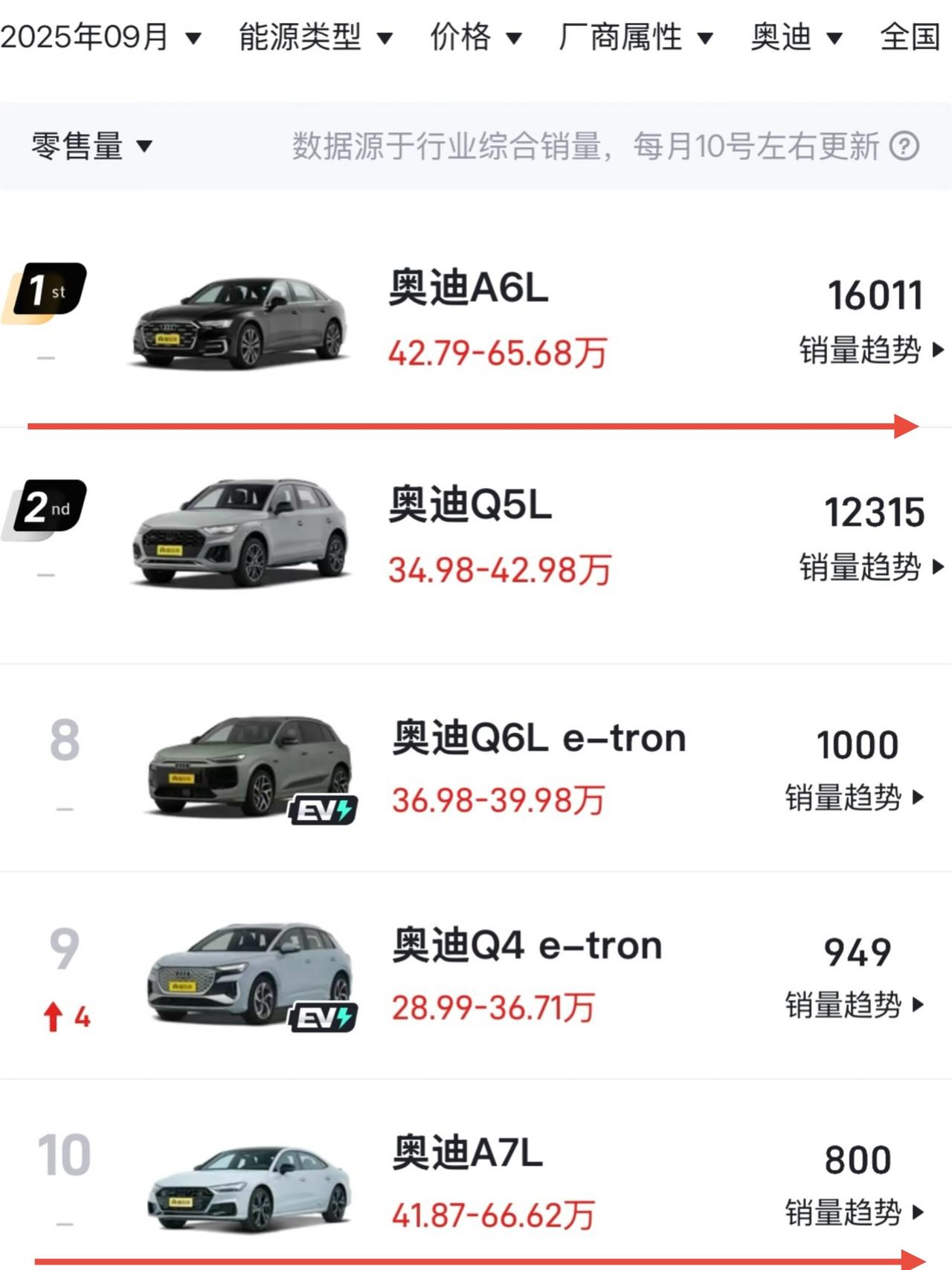 奥迪A6L9月销量16000+ 奥迪A7L9月销量800 明明A7L比A6L