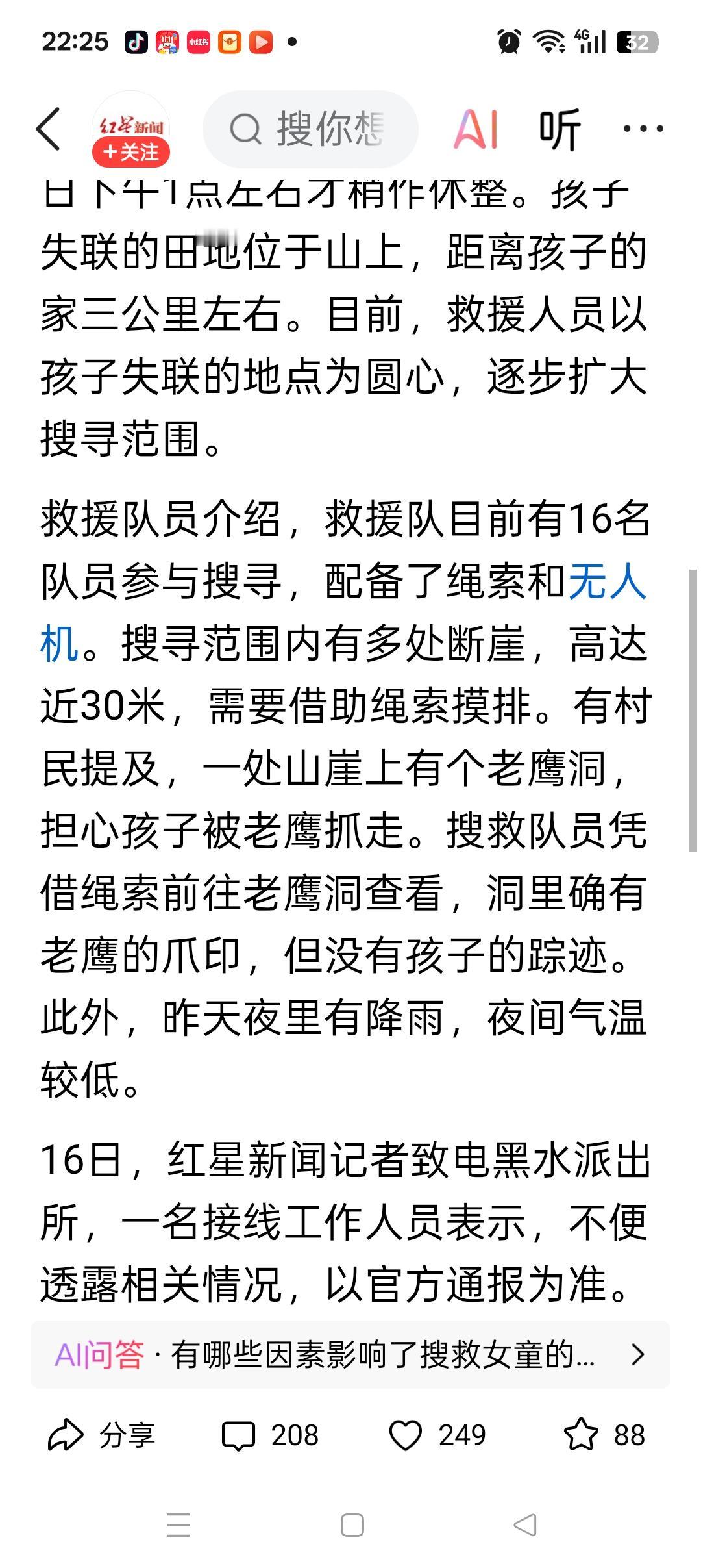 辽宁4岁女孩失联,附近没有井,也没有河。搜救人员在方圆三公里内来回搜寻了一遍,无人机,警犬也用上了,依然找不到哪怕一点点痕迹! 孩子的爷爷奶奶太粗心了,10月15号中午,带着孩子去山里干活。看见孩子熟睡,就把车门关了,留了一扇窗,把她一个人留在车里睡觉,这一去就是一个小时 有很多网友怀疑是人贩子所为,可能性不大。爷爷奶奶带去地里干活是偶然行为,且附近并没有陌生人居住。 大概率还是女孩自己醒了,找不到爷爷奶奶走丢了。隔了200米远,即使哭,爷爷奶奶估计也听不见。 10月份了,东北天气很冷,又是山上,一定要在方圆3公里内仔细搜寻,特别是一些山沟沟里。 以往的经验告诉我们,小女孩是走不远的[祈祷][祈祷]