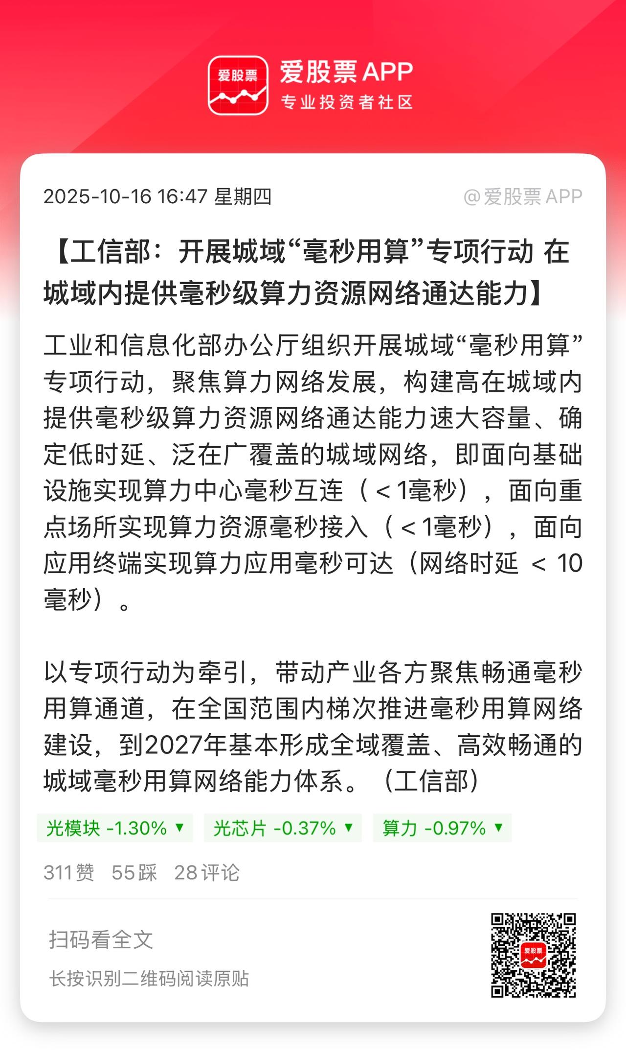 “毫秒用算”是个新名词,你们今晚都学习了吗? 爱股君去查了下,“毫秒用算”简单来说就是要建一个算力的高速公路。让用户在使用算力时,感受到的网络延迟被控制在毫秒级别,提高用户体验。 总之,“要想富、先修路”,要搞人工智能,就要把算力网络搞起来!国内现在还是比较缺算力的,这一次工信部所开展的专项行动,就是为了解决这一个问题。 主要利好三个方向,一直光通信(光模块)、二是国产算力服务(网络设施升级),三是利于AI应用加速落地。今天科技板块疲软,这个利好能不能给国产算力产业链打鸡血呢!