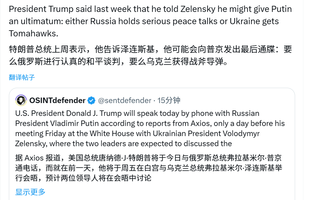 🔻川普也算是幽默完了,真拿援助泽连斯基几十发战斧导弹当筹码。