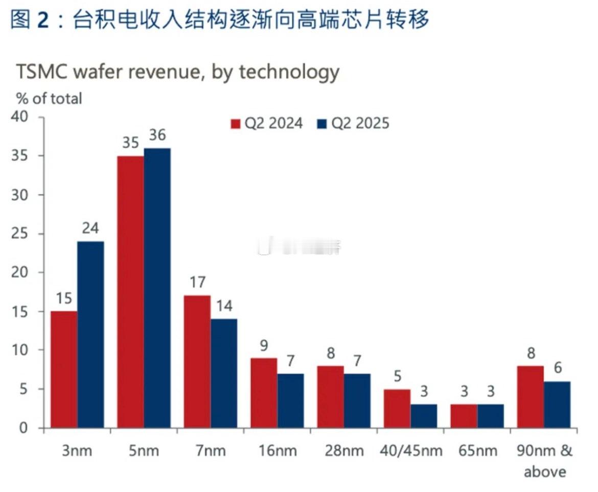 数据显示,到2025年第二季度,台积电3纳米和5纳米工艺的合计收入占比已从一年前的50%提升至60%,而7纳米及以上的成熟工艺份额则相应收缩。