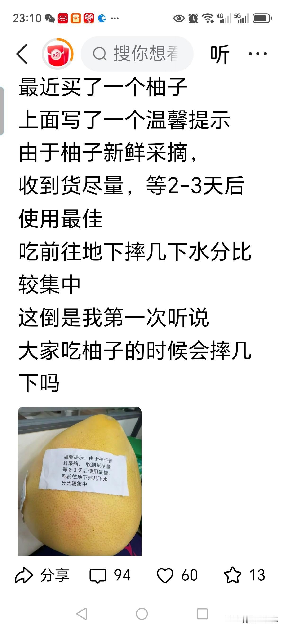 太搞笑了吧,这是我刷头条以来刷到最搞笑的一篇。 不知道有多少友友像我这样刷到这条头条的,然后义不容辞,果断的就把它转发了。 这个季节是吃柚子的季节,但是看友友写的这个买柚子的故事真的笑喷了。 柚子买回来放几天再吃很正常,大家都能理解,都明白,因为放几天的话,柚子本身的味道会更甜,原来从树上摘下的新鲜的柚子有一种酸酸涩涩的味道,但是放几天之后,他的手水分糖分会回收,所以会更甜,水分也会更充足。 但是友友说商家把柚子放几天和在地上摔几下的提示给贴上了标签,我就觉得奇怪了,我活了几十年,真的还是头一回听说吃柚子前要摔几下的道理,不知道是什么原因,也许是因为摔几下让它的皮软一点,也许是摔几下让它的水分能够更充分的挥发出来,但是真不明白为什么要摔。 看评论区有好多有油的神采评论,笑喷了。 原来不是我头一回,听说柚子需要酸酸才好吃,还有更多更搞笑的说酸柚子是什么什么,真的是人才济济呀[大笑]搞笑 搞笑段子 爆笑网友评论 搞笑评论神水平 爆笑奇葩事儿 现实搞笑段子 神反转搞笑段子