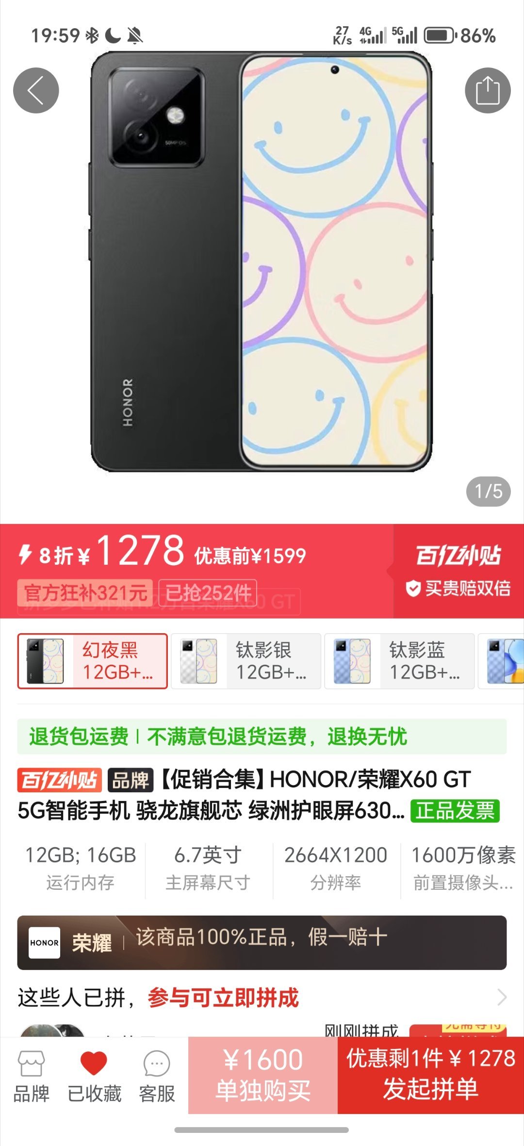 这应该是目前相当有性价比的一款荣耀手机——荣耀X60 GT,骁龙8+处理器、6300mAh电池+80W超级快充,5000万像素光学防抖主摄、立体双扬红外NFC都有,后续还能升级MagicOS10,12GB+256GB百亿补贴到手价仅需1278,还是非常不错的。
