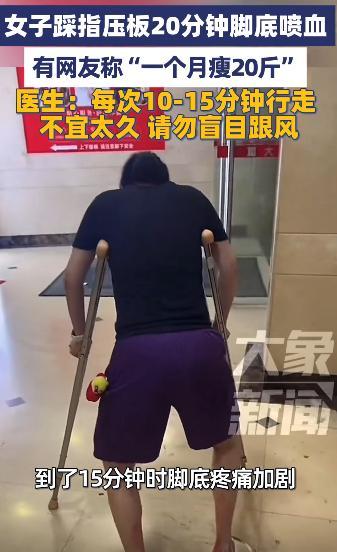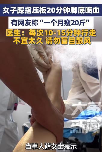 “悲剧还是发生了!”10月9日,上海,一女子为了睡个安稳觉,就跟风踩指压板,前10分钟,女子感觉一切正常,到了15分钟时,她开始感觉到疼痛,但她认为是正常现象,继续忍痛锻炼,结果又过了5分钟,她的脚底板突然喷血! 10月9日晚上,上海的薛女士洗完澡,光着脚踩上了客厅的指压板。 她当天刷短视频时看到有人说踩这个能助眠,想着自己最近总失眠,就翻出了之前跟风买的塑料板试了试。 刚开始十几分钟,脚底传来淡淡的酸胀感,像有人用指腹轻轻按穴位,她还一边踩一边刷手机,心里琢磨“以后每天都能睡个好觉了”。 可到了第15分钟,刺痛感突然冒出来,像小针扎在脚底,前脚掌和脚跟的皮肤已经发红,碰一下就钻心疼。 薛女士表示,短视频里说‘痛才说明有效果,忍过去就好’,既然别人能坚持,那自己也能行。 于是她咬着牙加快了脚步,没承想刚过5分钟,脚底传来一阵撕裂般的疼。 她抬脚一看,血没等慢慢渗出来,就像打翻的老抽瓶,“呲”地一下喷溅到沙发腿上,深色的印记瞬间洇开。 家人赶紧找纱布按压止血,可血根本止不住,只能连夜送她去医院。 医生拿着纱布按了足足十分钟才稳住血势,后来挑开伤口时,还从里面夹出三块碎皮,最后缝了六针。 医生称,薛女士的脚底皮肤早被塑料凸起磨破,她硬扛着继续踩,直接把皮下毛细血管踩破了。 然而打开短视频平台,输入“指压板”,首页全是“一个月瘦20斤”“零成本健身”的视频。 博主站在彩色塑料疙瘩上开合跳,背景音喊着“越疼越有效”,评论区里成百上千人排队打卡,有人晒体重秤,有人晒带着血泡的脚底,却还说“为了瘦,忍了”。 “这东西根本不是什么减肥神器,就是康复医学里的辅助工具。” 国家体育总局运动医学研究所的主任医师黄光解释,指压板的设计初衷是轻度刺激足底穴位促进循环。 正规的足底按摩单次不会超过30分钟,更不会让人选硬疙瘩板跑跳。 更让人揪心的是,这些指压板还藏着质量隐患。 上海去年抽检的二十款热销品里,三成凸点硬度超标,还有的增塑剂超标四到七倍,化学成分会顺着破皮的地方往里渗。 而且有业内人士透露,这类“痛觉内容”流量特别高,越疼的视频越容易被推荐。 那些笑容轻松的博主,拍视频时脚底早贴好了减压胶布,拍完立刻换软底鞋,却从不告诉观众这些细节。 说到底,还是大家的“捷径焦虑”给了这些噱头生存的空间。 衣柜里穿不上的牛仔裤、体重秤上居高不下的数字,让不少人急着找“不节食、不流汗”的办法。 指压板“零器械、零跑跳”的宣传,正好戳中了这种心理。 可实际上,踩十分钟指压板消耗的热量,还不如少吃两口米饭,反而可能把足底脂肪垫踩薄。 这层脂肪一旦萎缩就不可逆,以后走路都像踩石子。 养生的本质是让身体舒服,而非“比谁能扛痛”。那 些把疼痛包装成疗效、把流血说成排毒的噱头,终究骗不过身体的真实感受。 毕竟,健康从没有捷径,脚底板也不是韭菜,伤了可不会轻易长回来。 信息来源:大象新闻2025-10-14发布视频