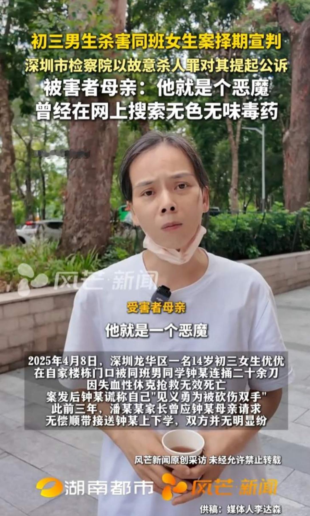 谁能想到?接送了三年的“熟人家孩子”,会在小区门口亲手杀了自己14岁的女儿! 深圳这位妈妈,现在头发全白了,眼神空得让人心疼——她14岁的优优,笑起来特别阳光,正备战中考想冲重点高中,4月18号在家门口没了,凶手竟是她接送了三年的男同学。这三年,她每天开车十几分钟接男孩上学,步行要半小时也没抱怨,连男孩姐姐都接了一年。可男孩就因为嫉妒优优的家庭,下了狠手,事后还回家撒谎说“见义勇为被砍伤”。 10月15号开庭,妈妈站在法院外说“没法原谅”,庭审上男孩承认罪行,听到可能判极刑才下跪求饶。妈妈现在总偷偷登优优的账号,跟自己发消息,闭眼就是女儿的笑脸。 “谁的命不是命?”她这句话戳得人眼泪直流。14岁从来不是违法的挡箭牌,只盼法律能给这位苦命妈妈一个公道!