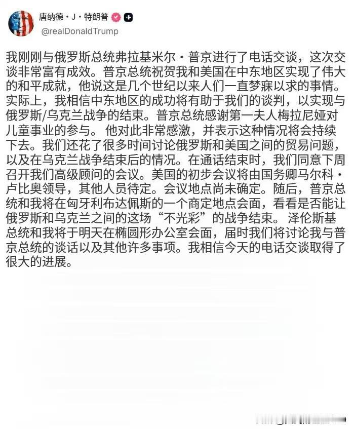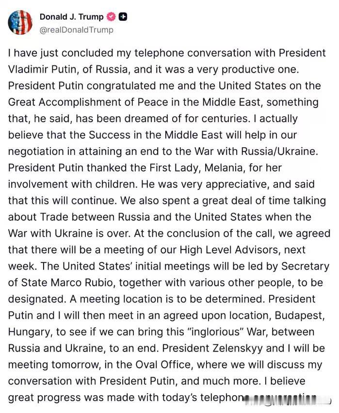 看来乌克兰总统泽连斯基的“战斧”导弹要没戏了,当地时间10月16日,美国总统特朗普与俄罗斯总统普京进行了长时间电话交流。 在电话会谈后,美国总统特朗普发文表示与普京的会谈非常富有成效,并表示双方未来将展开合作。 特朗普还表示,普京还向他表示祝贺,祝贺实现了中东地区的和平成就,特朗普表示,中东成就有利于与俄罗斯之间的谈判,以实现结束俄乌冲突。 特朗普还表示,未来将派国务卿鲁比奥带领团队与俄罗斯方面进行会谈,并根据情况,准备在匈牙利布达佩斯亲自与普京会晤。 特朗普强调,明天将与到访的乌克兰总统泽连斯基进行会谈,并与其讨论他与普京的谈话事项。 众所周知,泽连斯基此行的目的就是奔着武器,装备,以及“战斧”导弹去的。而特朗普此前多次谈论向乌克兰提供“战斧”导弹事宜,但始终没有表态。 而此时,在泽连斯基准备到访之际,特朗普突然与普京进行电话交谈,双方谈的似乎很好,特朗普很大可能已经做了决定,将以此为由与泽连斯基进行讨论,而泽连斯基讨要“战斧”导弹一事,恐怕要要因此落空了……