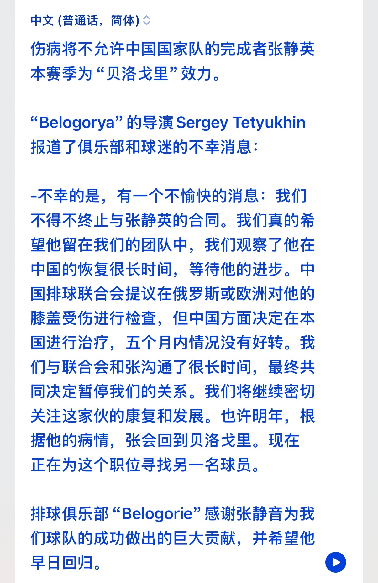 【伤病将不允许张景胤本赛季为“贝洛戈里”效力。】谢尔盖.特丘欣:报道了俱乐部和球迷的不幸消息:不幸的是,有一个不愉快的消息:我们不得不终止与张景胤的合同。我们真的希望他留在我们的团队中,我们观察了他在中国的恢复很长时间,等待他的进步。中国排球联合会提议在俄罗斯或欧洲对他的膝盖受伤进行检查,但中国方面决定在本国进行治疗,五个月内情况没有好转。我们与联合会和张沟通了很长时间,最终共同决定暂停我们的关系。我们将继续密切关注这家伙的康复和发展。也许明年,根据他的病情,张会回到贝洛戈里。现在正在为这个职位寻找另一名球员。