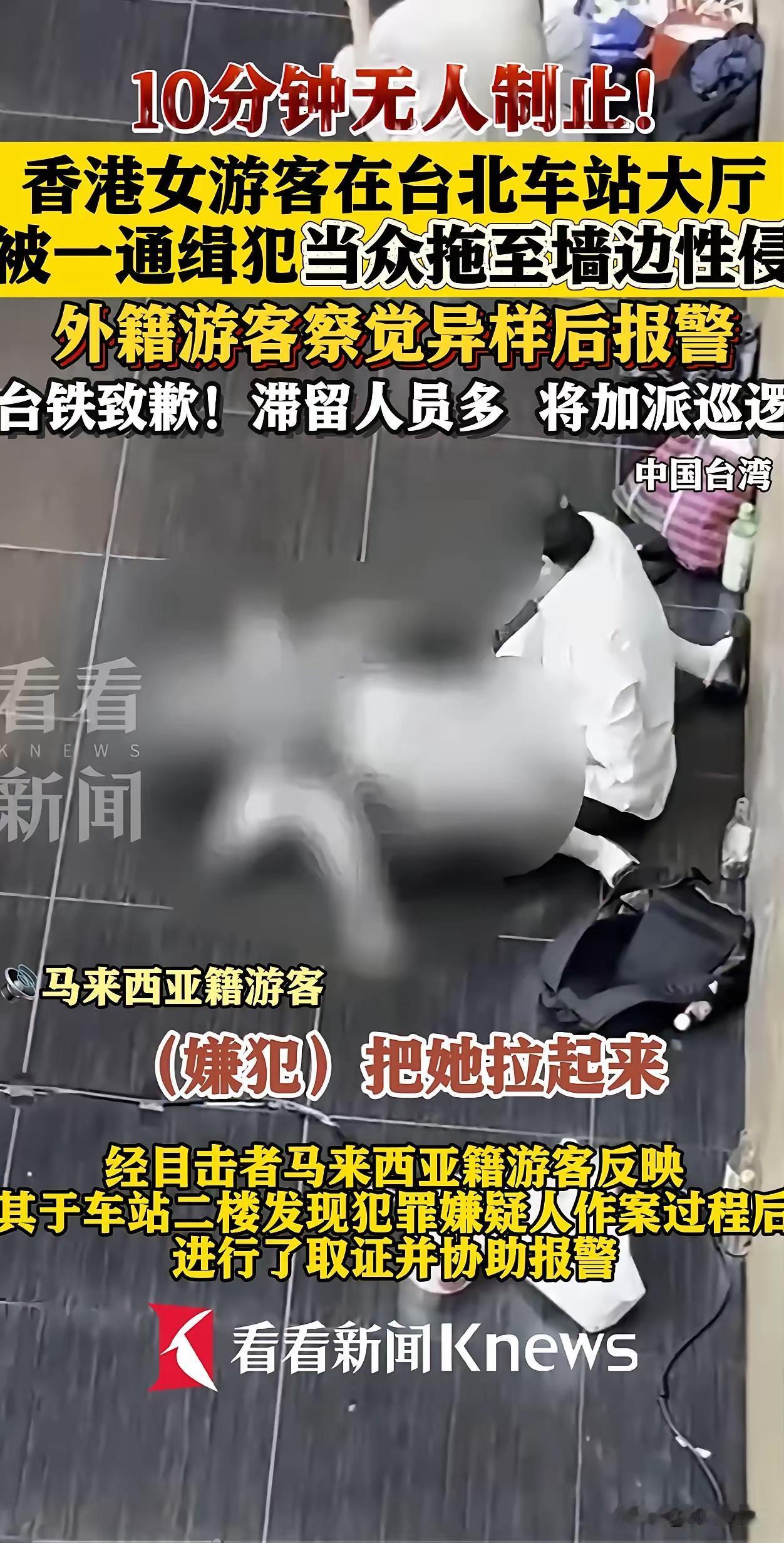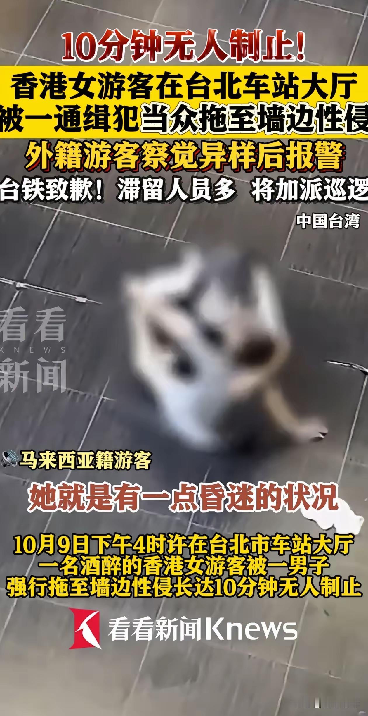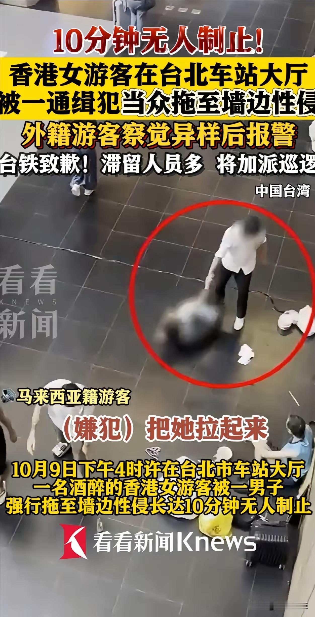 台北车站惊魂:香港女子醉酒躺地,遭通缉犯侵犯10分钟,20名路人路过全沉默 台北车站大厅里,一名香港女游客喝多了酒,浑身无力地躺在地上。她以为只是歇会儿,却没料到,一双恶意的眼睛已经盯上了她——这个男人有盗窃前科,还是警方正在通缉的逃犯。 见女子没力气反抗,男人直接上前抓住她的手,当着大厅里所有人的面,把她从中间拖到墙边,就这么当众侵犯起来。更让人寒心的是,这暴行持续了足足10多分钟,监控里清清楚楚拍着,近20个旅客从旁边走过,有人看了一眼就躲开,有人假装没看见,没有一个人停下来制止,甚至没人掏出手机报警。 最后站出来的,是个马来西亚来的学生。他当时在二楼等朋友,一开始还想着“这么多人,肯定会有人先帮忙”,可等了半天,楼下还是一片死寂,他越看越不对劲,赶紧叫上朋友,一边偷偷拍视频留证据,一边立刻报了警。警察赶来后,才救下女子,当场把那名通缉犯抓了起来。 女游客醒酒后,才知道自己遭遇了什么,现在已经去医院验伤,准备起诉那个男人。 事后,台北车站出来道歉,说“当时滞留人员多,没及时发现”,还承诺以后会加强巡逻,多留意旅客的异常情况。 可网友们不买账:有人说,就算不敢冲上去制止,站在远处大声喊一句“有人耍流氓”,或者悄悄打个报警电话总可以吧?这种冷漠,把受害者推到了最孤立无援的境地;也有人质疑车站的安保,“人多”根本不是借口,平时的巡逻和管理去哪了?就算现在说要整改,大家还是担心以后再出这种事。 编辑‖夏雨 文‖夏雨