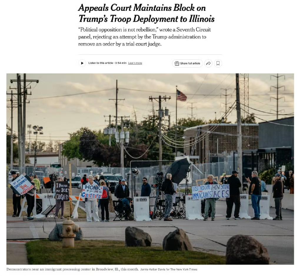 上诉法院驳回特朗普要求向伊利诺伊州部署国民警卫队的请求 联邦上诉小组周四同意下级法院法官的意见,阻止特朗普政府向芝加哥地区部署国民警卫队。 三名法官是伊拉娜·罗夫纳、戴维·汉密尔顿和艾米·圣伊芙。分别由前总统布什、奥巴马和特朗普提名。法官们说:“政治反对并非叛乱,”他们写道。“示威者为抗议联邦政府的移民政策和行动而采取的激烈、持续且偶尔暴力的行动,仅此而已,并不构成反抗政府权威的危险。”
