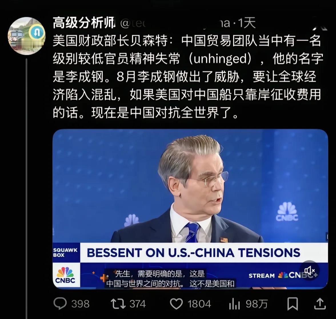 终于知道贝森特为什么要对我方谈判代表进行人身攻击啦。据未经证实的美媒挖掘出来的消