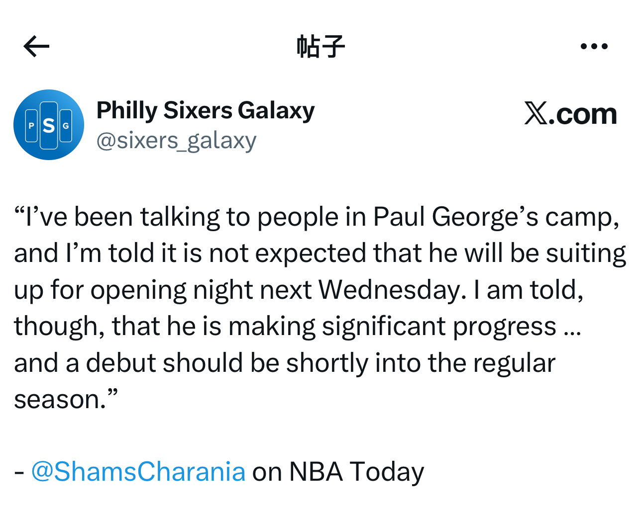 最新消息!ESPN记者Shams:“我一直在和保罗·乔治团队的人沟通,他们说乔治预计不会在下周四76人队的常规赛揭幕战中上场。不过,他们说他正在取得显著的进步…常规赛开始后不久应该就能上演首秀了!”[围观]