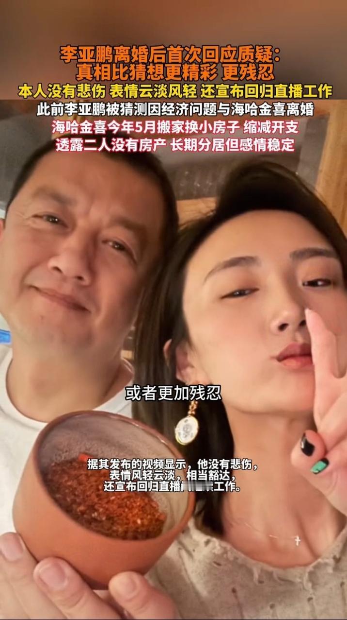 当李亚鹏坐在镜头前,用一句“真相比猜想更精彩,也更残忍”揭开离婚迷雾时,那份云淡风轻的松弛感,和外界对他与海哈金喜婚姻的诸多揣测形成了强烈对冲。 谁能想到,这个曾被猜测因经济困局而婚姻破裂的男人,在宣布离婚后首次亮相时,没有半分悲戚,反倒带着一种“翻篇了”的坦然,转头就宣告要回归直播战场。可若回头看看那些细节,又觉得这场“落幕”满是伏笔——海哈金喜今年5月悄咪咪搬进小房子,缩减开支的动作曾被解读为“共渡难关”;两人长期分居却对外称“感情稳定”的说法,如今想来更像一层薄纱,一戳就破。 从“分居维稳”到“搬房缩支”,再到如今李亚鹏一句“别猜了”的坦荡,这段婚姻的真相像藏在褶皱里的针,看似平淡的叙述里,每一处转折都藏着让人唏嘘的戏剧性。他挥挥手告别过去,转身扎进直播事业的样子,倒像是在用行动证明:生活的精彩或残忍,终究要自己亲手书写。(由AI生成,仅供参考)李亚鹏