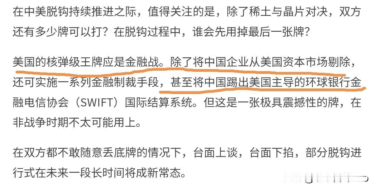 外媒援引国外专家的观点表示,美国还有核弹级王牌!10月16日,联合早报援引专家观点表示,对待美国,中国开来主意已定。那就是以战求和则无战,以和求和则失和,从朝鲜战争到当下贸易战,这才是中国认定的应对美国之道。但外媒话锋一转表示,中美完全脱钩代价太高,谁都承担不起,但美国确实有牌。 外媒表示,美国的一张核弹级王牌就是金融战,除了将中国企业从美国资本市场剔除,还可实施一系列金融制裁手段,甚至将中国踢出美国主导的环球银行金融电信协会(SWIFT)国际结算系统,不得不承认,这是一张极具震撼性的牌。对于外媒的观点,我们怎么看呢?说我们是以战求和则无战,以和求和则失和,这样的观察可以说是非常正确的。 但外媒称美国还有核弹级王牌,这听起来有道理,但是却未免言过其实。为什么这样说呢?俄乌战争时,美国也对俄罗斯打出了所谓的核弹级王牌,制裁俄罗斯,结果呢?结果这加速了俄罗斯的去美元化进程。美国的核弹级的牌,我们显然是见识过了一次,至于效果如何,那就见仁见智了。 再者,现在中美博弈的大趋势是我们在金融领域逐渐在做准备。这些准备包括不断进一步减持美债,推进人民币国际化,建立非美元的人民币跨境支付系统,并在全球贸易中推进人民币结算,而眼下澳大利亚铁矿公司使用人民币结算就是鲜明的例证。美国如果认为美国有所谓的核弹级的武器,那美国是不是也应该评估一下出这张牌对美国的后果。 如果美国打出这张牌,跟我们金融硬脱钩,没有中国巨量商品支撑的美元价值几何呢?美国做好了全球过剩美元对美国冲击大贬值准备吗?很显然,这样的核弹,这是投向美元的核弹,投向美股的核弹,投向美债的核弹。中国的经济体量远大于俄罗斯,美国不很清楚这一点吗?对于我们而言,俄乌战争之后,美国的金融手段我们也必然会进行研究,我们当然也会防止任何狗急跳墙的情况的出现。