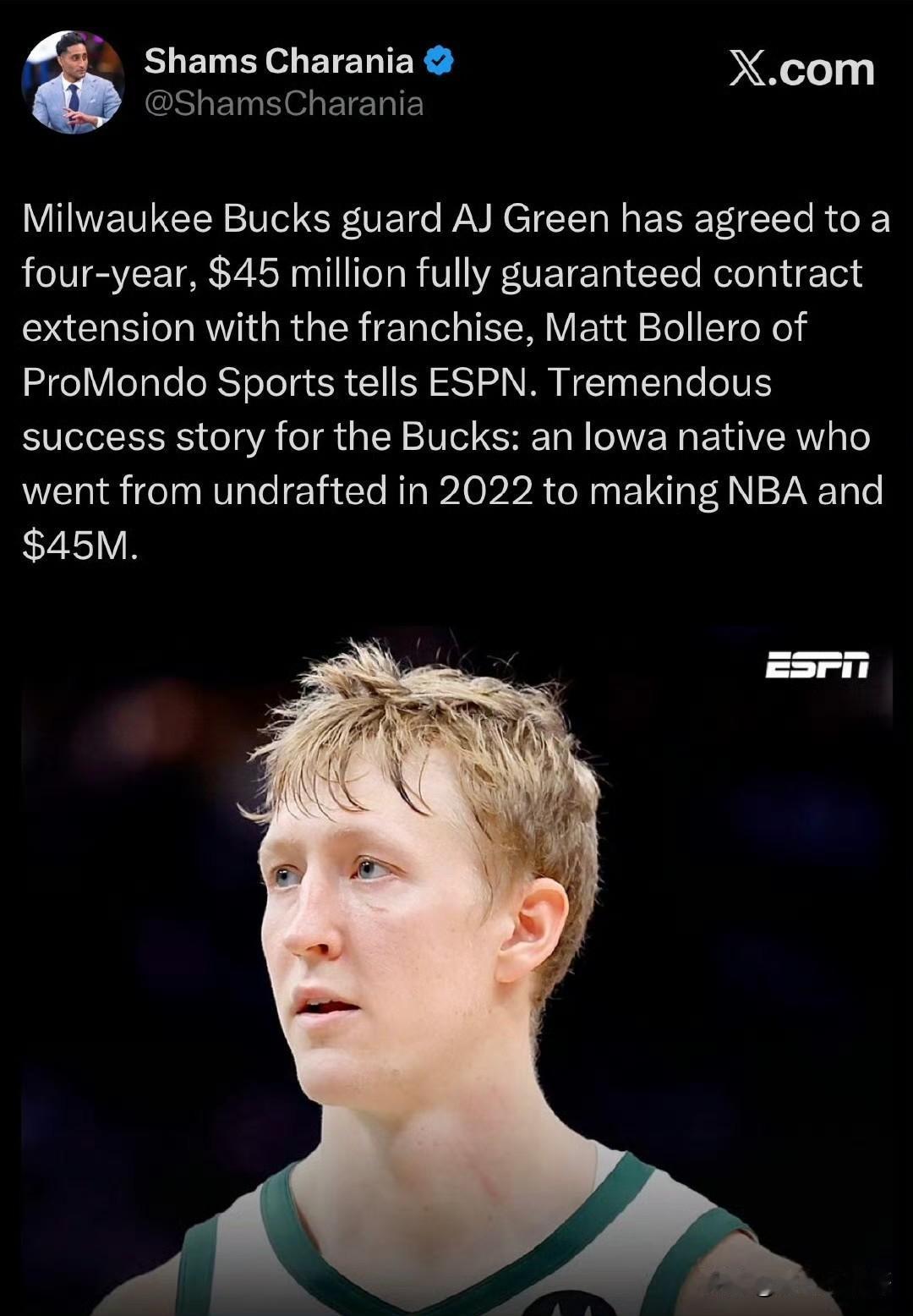 草根逆袭了!!!AJ-格林4年4500万续约雄鹿! 根据记者Shams最新消息透露,后卫AJ-格林选择4年4500万美元续约雄鹿,这份合同没有给出任何附加条件,AJ-格林将为雄鹿效力直至2030年夏天。 叫格林的太多了,都还是有实力的,AJ格林也属于草根逆袭成功了,他是一名落选秀,前几年都是双向合同或者短期合同,但是雄鹿还是发掘了他的潜力,这家伙真的是神射手,三分命中率高达42%,尤其是接球投更加出色,接近45%,这样的球员站在三分线外你敢放他吗? 雄鹿这次的续约是明智的,没有让他进入自由市场的机会,如果明年进入自由市场,这1100万左右的价格是拿不下来的吧。 恭喜AJ-格林,恭喜雄鹿,他们又赚大了!