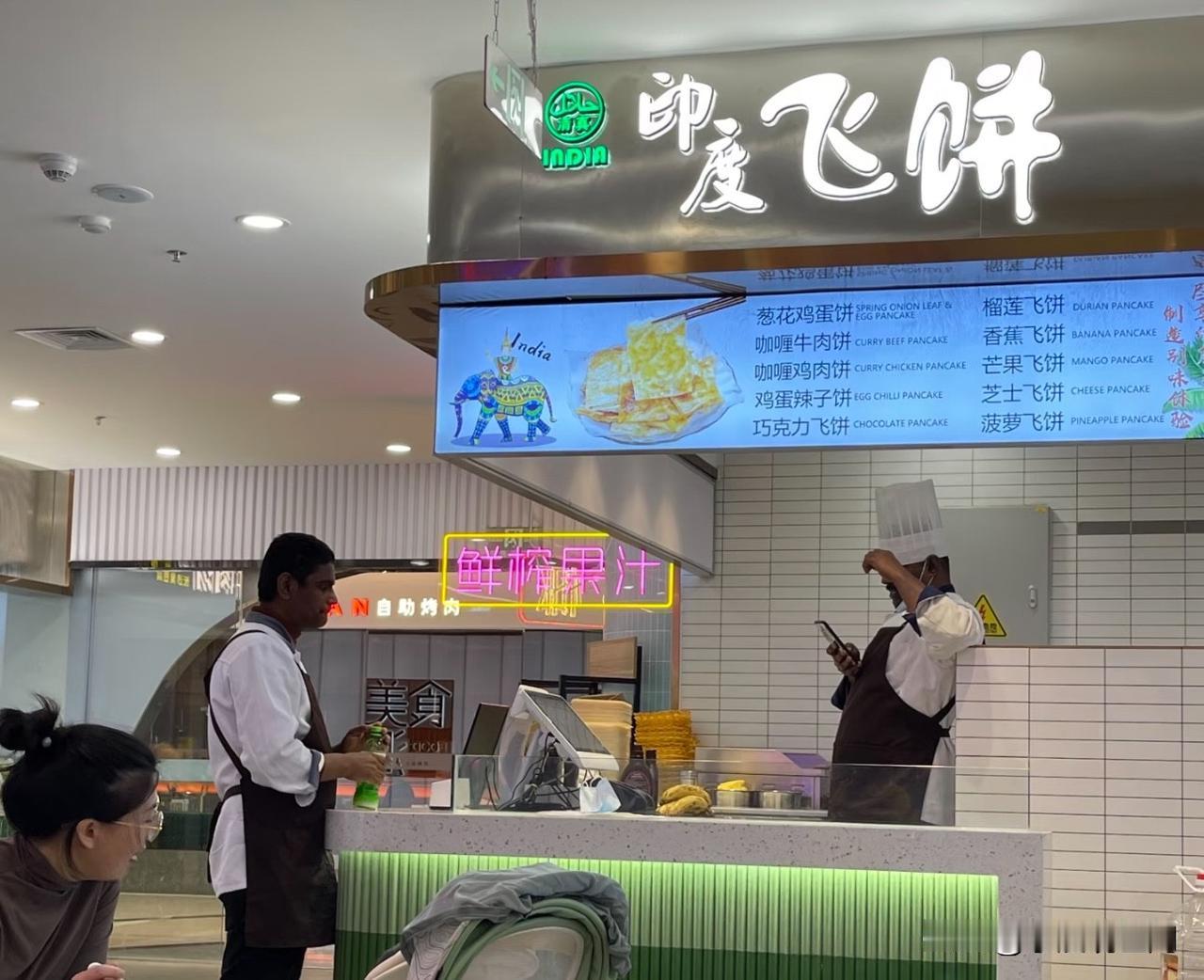 这两个印度人在北京一家商场开了一个小吃店,最近生意很不好! 这个店在美食街入口,