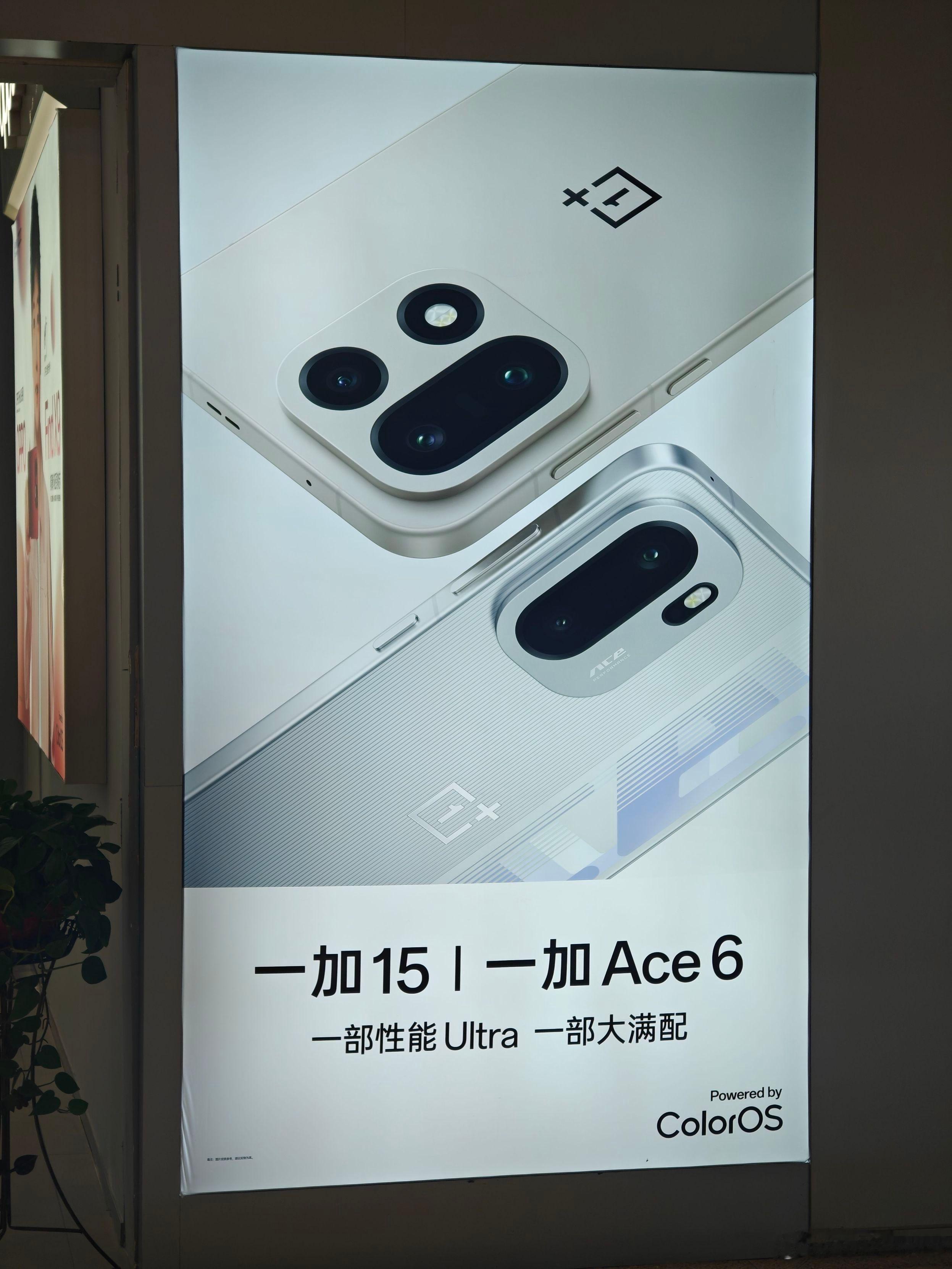 一加 15和一加 Ace 6官宣了,线下物料也上了,Ace 6这个配色有Ace大logo,小矩阵deco和一加15同源设计。