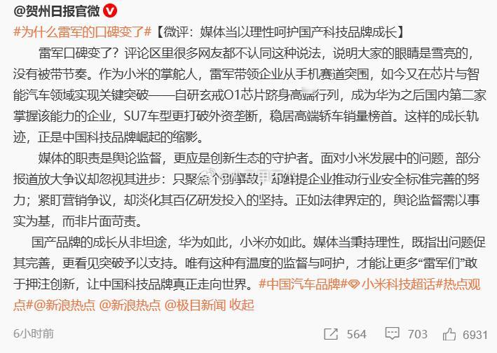 国产品牌的成长从非坦途,华为如此,小米亦如此。媒体当秉持理性,既指出问题促其完善,更看见突破予以支持。唯有这种有温度的监督与呵护,才能让更多“雷军们”敢于押注创新,让中国科技品牌真正走向世界。