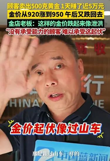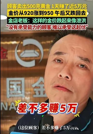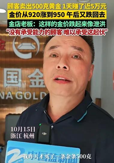 浙江杭州,顾客为了赚块钱,直接买了500克黄金,第二天就卖了,仅仅1天时间,就赚了近5万元,但是,金店老板也说了,这个金价上午920,之后涨到950,午后又跌回去920。所以,金店这样的金价跌起来像泄洪,没承受能力的,难以承受这起伏! 杭州这家开在老街区的金店,最近成了街坊议论的焦点,起因就是那个一天赚5万的顾客。听老板说,那哥们儿看着挺普通,穿个夹克衫,进店直接问“今天金条多少钱一克”,得知920元后,没多犹豫就拍板要500克,当场刷了46万,连包装都没要,揣着金条就走了。 谁能想到第二天一早,这顾客又乐呵呵地回来了,说要卖金条。老板当时还纳闷,结果查了下当天的开盘价,直接惊着了——一夜之间金价涨到了930元,一克赚10块,500克正好5万。顾客拿着钱喜滋滋地走了,留下一店人唏嘘:“这钱赚得比抢银行还快!” 老板见多了这种短线炒金的,反观一点也不羡慕他说:“现在金价跟坐过山车一样,上一秒让你笑,下一秒就让你哭。 他指着电脑上的金价走势图给大家看,那曲线跟心电图似的,前一天上午还是920元,中午突然蹿到950元,午后又“唰”地跌回原点,跟坐跳楼机似的。 其实这种操作在行内叫抢帽子,玩的就是心跳。今年黄金市场特别刺激,国庆后国内金价从720元/克一路冲到980元,又跌回920元附近。上海有个大妈更绝,8月460元/克囤了3公斤金条,10月中旬950元/克抛售,两个月净赚147万。 当然风险也是实打实的,就比如2013年4月金价暴跌时,不少大妈在310元/克高位冲进去,结果套到2020年才回本。黄金虽然保值,但短线波动比股票还凶。之所以这么疯,还是跟国际上的事脱不了关系——一会儿地缘冲突升级,大家都抢黄金避险,金价就往上冲;一会儿美元又升值了,黄金立马就掉价,这些都不是普通人能掐算准的。更别说还有资本在背后操盘,故意放出消息引散户跟风,等大家都上车了再反手抛售,好多人不知不觉就成了“接盘侠”。 说白了,杭州这顾客能赚5万,纯粹是踩对了点,靠的是运气。黄金这东西,要是为了长期保值,买点金条放家里还行,能对抗点通胀。可要是想靠短线炒金赚快钱,那真得掂量掂量——你以为自己是抓着了暴富的机会,其实可能早成了资本盯着的“韭菜”。毕竟运气这东西,可不是每次都能撞上。 人还是踏实一点好,好好把本职工作做好,不要异想天开,脚踏实地才是该有的初心,不要相信自己是运气王,不然一失足成千古恨。各位读者你们怎么看?欢迎在评论区讨论。