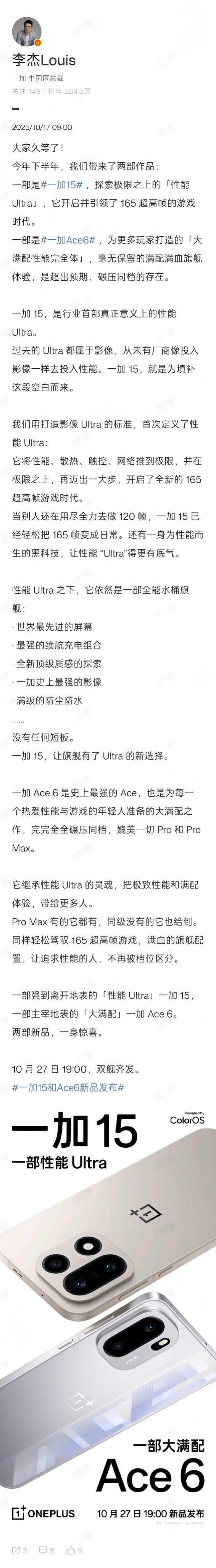 一加15终于官宣了!10月27日西安,一加 Ace 6也一同发布!