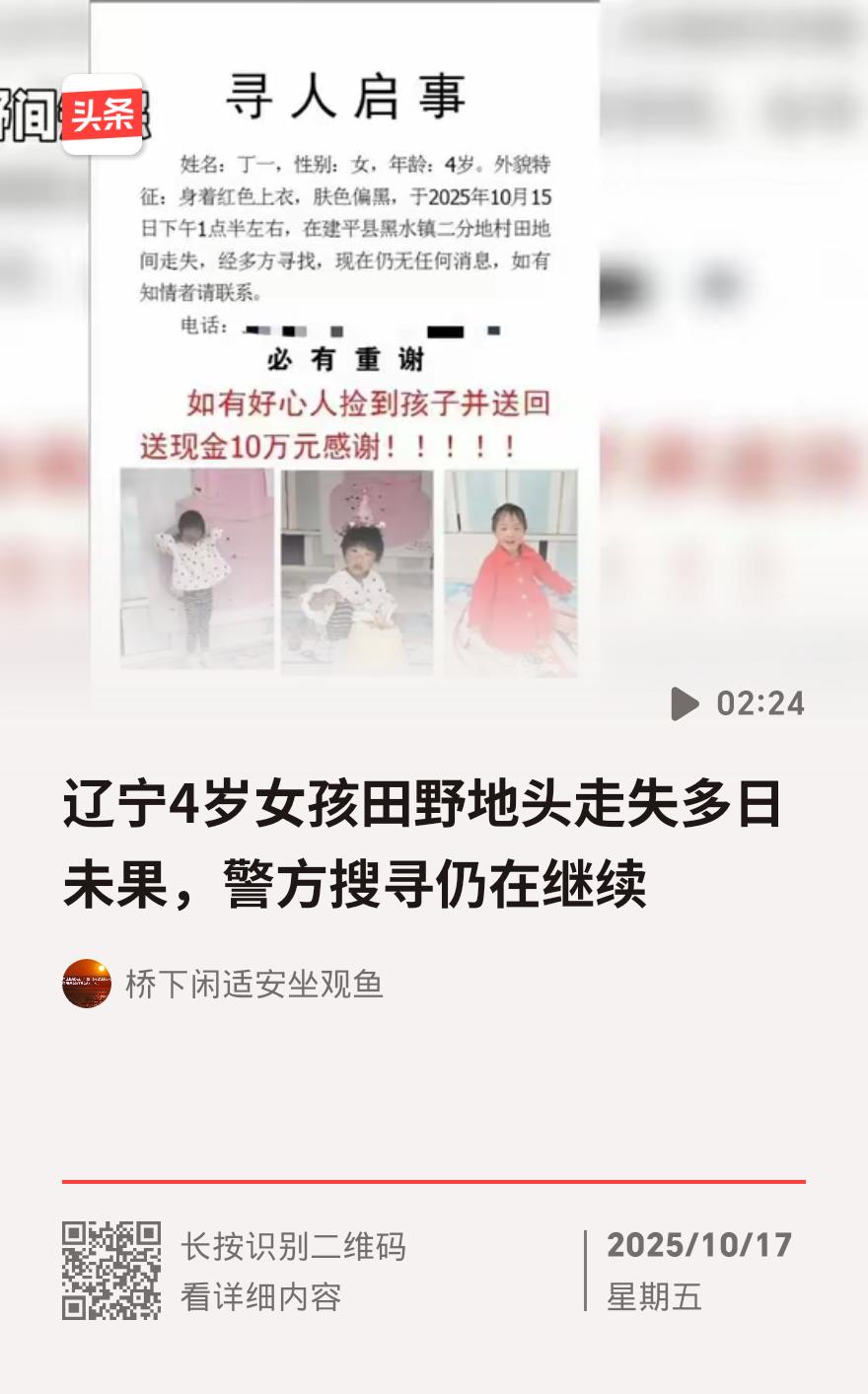 10 月 15 日下午 1 点半,辽宁省朝阳市建平县黑水镇大营子村,一名 3 岁女童丁某在自家停在地头的面包车里不见踪影。东北四岁孩子 朝阳乡 辽宁朝阳村