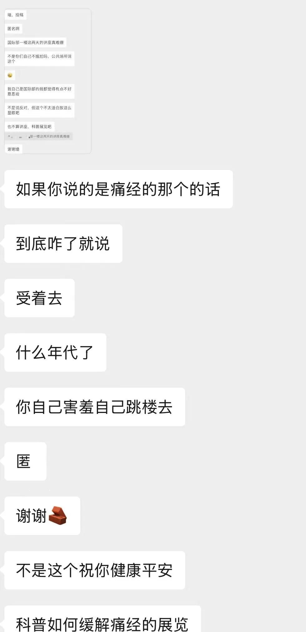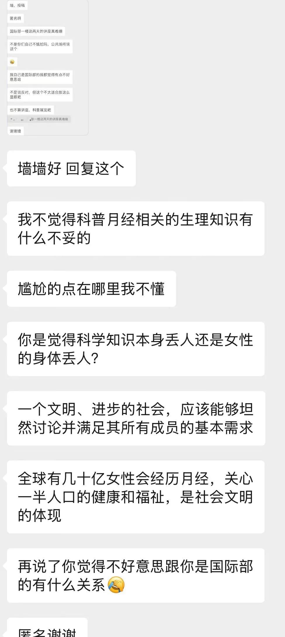 人类群星闪耀时 来自校园墙,侵权可删。 ✧ 长期以来,月经被污名化、被轻视,而现代社会正在打破这种沉默,越来越多的女性开始在公共场合如校园、职场、社交媒体上坦然谈论痛经,而学校办科普展览的目的也正是在鼓励宣扬这种现象。 ✧ 全球几乎有一半的人口在一生中都会经历月经。它就像心跳、呼吸或者消化一样,是一个正常、健康、自然的生理过程。我们不会觉得谈论“饿了”或者“感冒了”是羞耻的,为什么谈论月经就是呢? 我为敢于发声的女性而自豪,为办展览的学校而自豪。