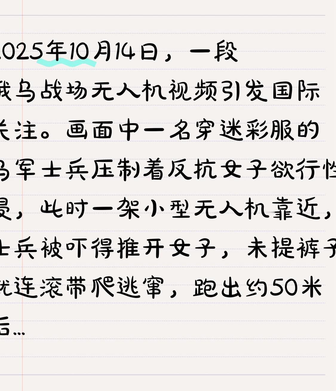2025年10月14日,一段俄乌战场无人机视频引发国际关注。画面中一名穿迷彩服的乌军士兵压制着反抗女子欲行性侵,此时一架小型无人机靠近,士兵被吓得推开女子,未提裤子就连滚带爬逃窜,跑出约50米后被击中倒地。 对于无人机操作员身份,俄乌双方各执一词。俄媒称是俄军第58集团军某侦察分队士兵,执行侦察任务时发现暴行,果断干预并呼叫火力支援;乌媒则坚称是乌军内部纪律监督员操控,施暴士兵为临时征召预备役,涉事操作员因“战场处置果断”被调往突击部队,截至10月16日乌军方未正式回应。 这并非乌战场首次曝出性暴力事件,联合国人权高专办2024年报告指出,自2022年冲突升级,已记录至少37起涉及乌军人员的性侵或性骚扰指控,其中12起集中在2024年下半年,不过乌军实际定罪率不足5%。俄罗斯无人机 乌军新型无人机 俄式无人机 无人机战争 乌军无人机小组 美乌无人机协议 英乌无人机协议