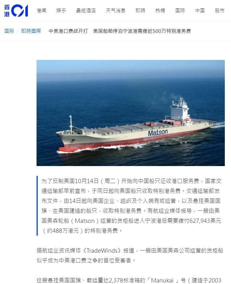 第一艘被中国收“特别港口费”的美国船只出现!八十米长刀下无冤魂,10月16日,悬挂美国国旗,载运量为 2,378 标准箱、由美国美森航运(Matson)运营的“Manukai”号靠泊宁波港,卸货时被收取港口特别费,金额约为627,943美元。据媒体报道称,Manukai号集装箱运输船是13日靠泊宁波港的,并于14日卸货。 中国开始打造立威人设了,谁不让我好过那谁也别想好过,谁跟美国混与中国作对就打死谁! 因为历史原因,国内大部分媒体人以及企业等都是以美西方颁发的各种法律文件为“圣旨”,甚至国内还有专门研究如何符合美国政策与法规的机构。在改革开放初期以及加入WTO那会这个操作没毛病,因为美西方国家已经制订出了一套符合西方世界价值观、有利于西方国家的“公平”规则。 研究美西方国家的政策,如何避免损失,怎样绕着继续赚钱,这事不寒碜,为了挣钱这事不寒碜。这事情在2018年以前还能玩,被人欺负了大不了忍一下,美国出新规了,研究下规则如何绕一下避开被直接冲击,美国人出手打击了,那就谈个协议,买个几千亿农产品搞搞关系,这事儿也就过去了。 然后.....鉴于自己在商业上的成功,特朗普将此书奉为圣经,将商战中的一套全部搬到了总统的行为准则上,在国内与外交事件上都执行所谓《交易的艺术》,信用成了草纸,承诺必须当场兑现,要不然特朗普转身就翻脸。 2018年中美谈判,谈成了过夜就翻脸,最后好不容易谈成中美签署了中国向美国采购不低于2000亿美元的采购协议,执行没多久特朗普又层层加码,然后有谈判又反悔,事情进入了死循环,这事儿就没法干了,在这个时候如果还想着去研究美国的政策就不可能了,因为美国随时会改变政策,没有政策立马给你立一条! 痛定思痛,中国也不玩了!还是积极准备脱钩吧,制造业、高科技产业、农业甚至犄角旮旯的领域,凡是与需要依赖美国都准备起来了,当7年之后的特朗普再次回到总统宝座时,这个世界早就和他当年为所欲为的时候已经不一样了! 中国不再与美国“讲道理”,而是开始用事实说话 特朗普在上任后两次对中国加芬太尼关税,中国立马就反制了;4月2日后美国对全球加征关税,4月4日中国立刻宣布反制措施,是全球第一个对等报复的国家,之后双方报复措施螺旋上升,最终还是4月底美国认怂,5月初谈判双方回到原点。 但是美国不甘心啊,这百试不爽的关税大棒+高科技制裁+整个西方盟友围剿对中国怎么就不灵光了?美国拿着大棒回去把西方盟友挨个敲了一遍,还没开始第二轮个个都哭爹喊娘了!很灵光啊,所以5月之后美国故态复萌,反复与中国死磕,结果再次被打回原形,从5越到8月,中美多次谈判,每次美国都只能延期三个月。 10月初以来,中国又换了新玩法了,开始用美国人的套路,将整个产业链绑定,所谓的一棍子打死一群人就是这个玩法。起因就是9月29日美国出台的50%股权穿透连坐制,大意是只要在美国限制的实体内,其对外投资股权超过50%的公司,自动会受到美国制裁,美国就是打算用这种方式将中国高科技一网打尽。 中国在10月9日也出了一套政策,稀土使用价值超过0.1%的产品与设备都将受到中国管制,这个打击面甚至比50%股权穿透连坐制还要大,几乎波及了所有搭边一点高科技的领域,各位不要惊讶,现在中国干的就是这种要让全球跟着西方制裁中国那一撮瑟瑟发抖的操作。 另一个案例是美国对加收特别港口费,这个是拜登时代贸易代表戴琪、就是那黄皮白心的香蕉人提出的方案,当时想着美国不造船,美国船企船只只有中国的1/10,本想着捞中国一笔。所以对中国制造和中国运营的船舶加收港口费,美国纯赚! 结果中国在美国的基础上加了一条,对美国资本以及美国籍控股25%及以上的船舶加收港口费,这样一来被套进去的美国船就太多了,双方对决之下,中国还能多挣一点。 这次对韩华海洋美国子公司的制裁又提升到了一个新的高度,之前中国很少对其他国家的企业单独制裁,一般都是个人比如CEO以及高管比较多,但这次不仅单独出一份文件制裁,并且制裁措施还非常严厉: “禁止中国境内的组织、个人与其进行有关交易、合作等活动”,没有“许可证豁免”或“人道/维修例外”条款,也没有设截止期。 史无前例的措辞,原因就是韩华海洋在今年3月份向美国提供了各种造谣中国船舶制造业的所谓证据,不制裁它制裁谁? 中国摊牌与美国对抗,最重要的任务就是让全球企业明白中国制裁的力量。不要认为只有美国制裁很厉害,也要让大家知道跟中国对着干到底有多严重的后果!