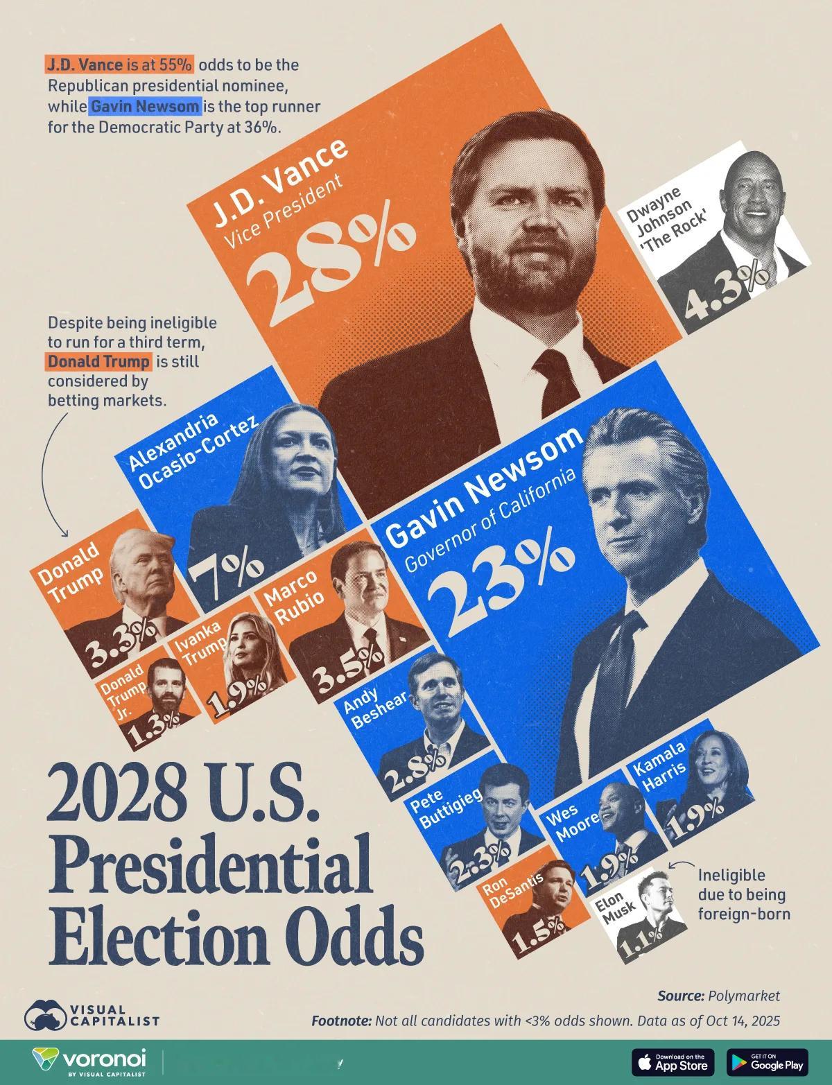 2028美国大选赔率已开:万斯对阵纽森为最大可能