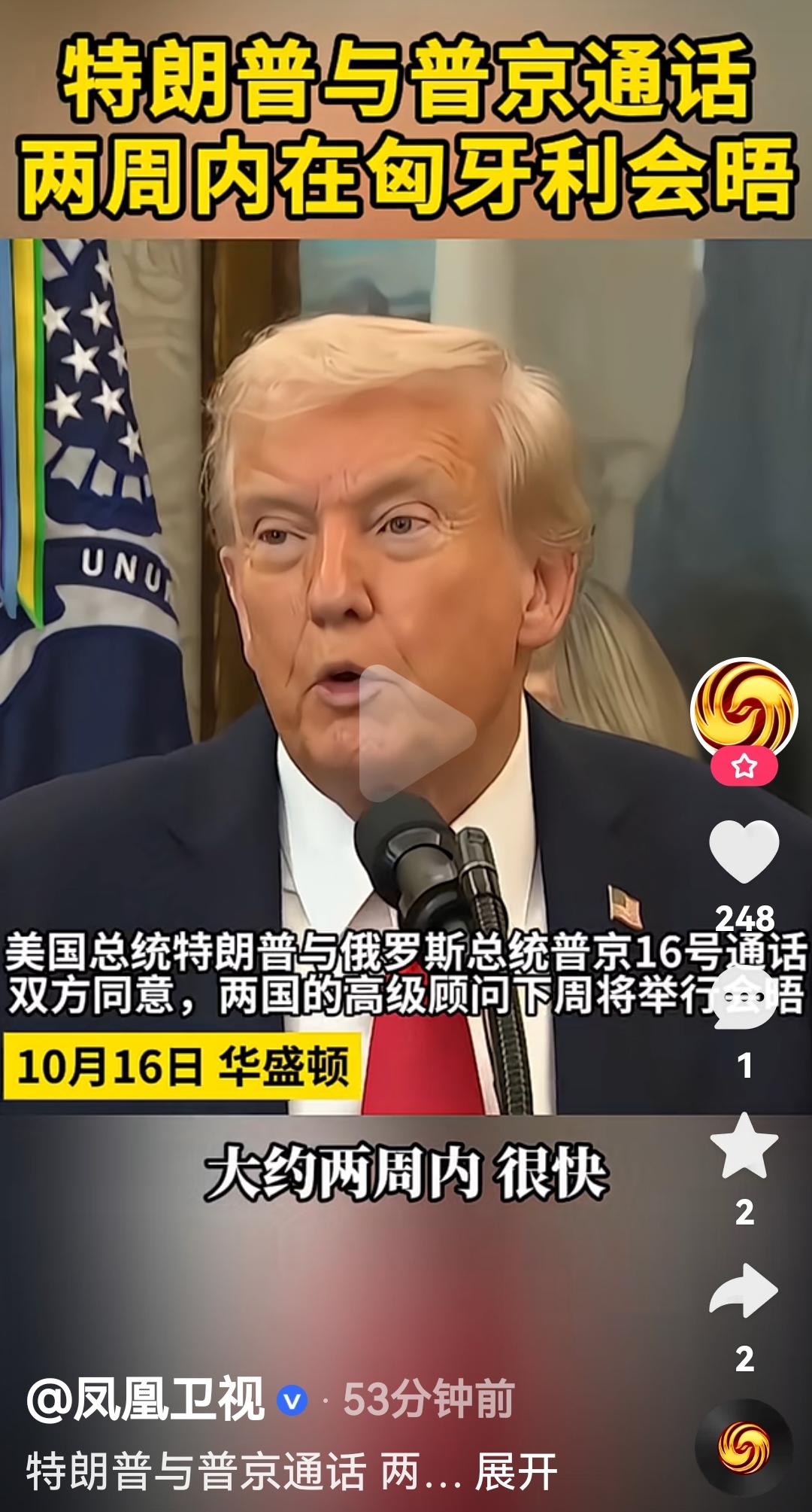 特朗普和普京的博弈感觉要见底牌了 根据媒体报道,10月16日特朗普和普京通话,确定两周内在匈牙利会晤 这也是特朗普准备批准向乌克兰提供可以打击俄罗斯境内目标的“战斧”导弹和普京已批准和古巴军事合作前的会晤 就是相互摸一下底牌 如果谈不拢利益,就各自干各自的事情了 特朗普也晾自己的手段了,普京也接招晾自己的导弹了,并且特朗普老婆也说了最近将近一年和普京都有书信来往 所以这次会晤也就是彼此更深的试探 普京与特朗普近期能否通话尚不确定 你觉得特朗普想与泽连斯基会谈目的是什么 图片来自凤凰卫视视频