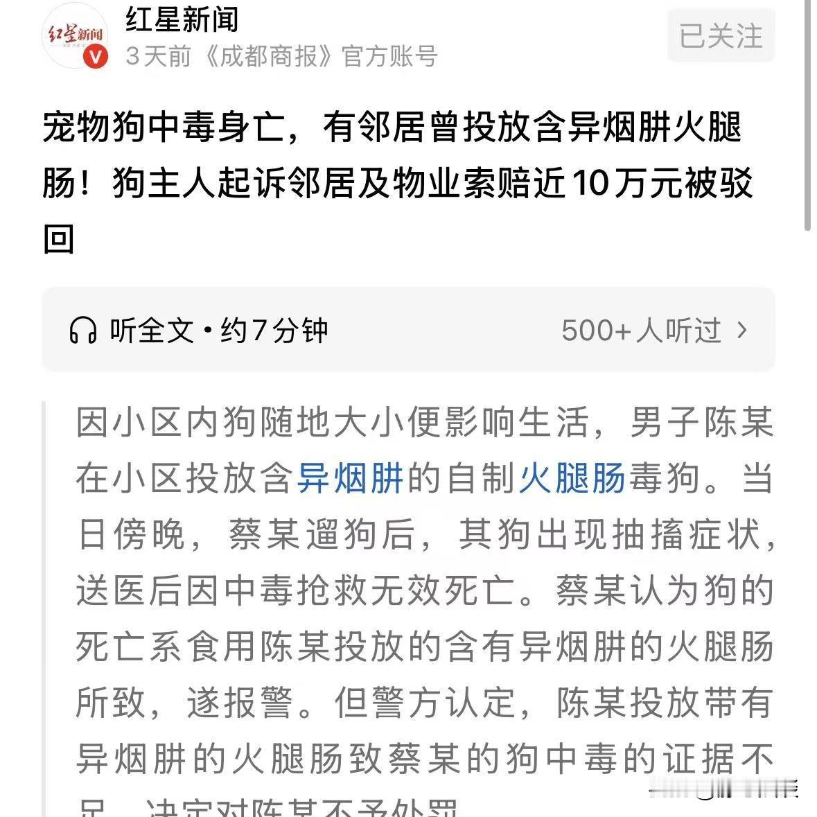 不是谁惨谁有理!江苏南京,因小区内的狗经常在家门口大小便,其味道已经影响生活,业主一气之下在楼下投放含有异烟肼的火腿肠。没成想当天晚上一只泰迪狗就中招,送医后狗主花了4.6万给爱狗抢救,但还是因中毒太深没抢救过来,事后又花2699元给小狗办了个告别仪式,狗主痛失爱犬情绪崩溃,将投毒的人和物业都告上法庭,索赔含精神损失费近10万元。没想到法院竟然这样判了! 陈某是某小区92栋业主,自打他搬进来,家门口、连廊里总有人家的狗随地大小便,那味儿飘得满楼道都是。 他找物业反映,跟养狗的邻居沟通,来回折腾了好几次,啥用没有。 这天陈某在自家院子里干活,眼见一只小狗在路边乱拉乱尿,那火一下就窜上来了,直接在门口贴了一张警告书。 内容写的明明白白:养狗人注意,因狗乱拉乱尿的气味,已经严重影响本人,我将在91至94栋连廊将投异烟肼火腿肠,遛狗到别处,否则后果自负。 这警告书贴出去,却没见养狗人的收敛,3月8日,陈某一开门就在门口看见一摊尿。 忍无可忍的他直接做了6根带有异烟肼的火腿肠投放在92栋周边的草坪上。 同一天,66栋的业主蔡某带着自家养了10年的泰迪狗可乐遛弯。 蔡某带着爱狗在湖边溜达一圈后又在小区转了一圈。 谁知,回家没多久,爱狗就不对劲了,精神越来越差,后来直接开始抽搐,浑身发抖。 蔡某紧急将爱犬送至医院,经检查为药物中毒,蔡某心痛不已,让大夫不管花多少钱都要将它治好。 一个多月的时间,蔡某花了近4.6万治疗费,还是没能留住爱犬的生命。 4月24日,这只陪伴蔡家十余年的泰迪犬因肝肾衰竭离世,蔡某又花费2699元给爱犬办了个告别仪式。 可悲伤过后,更多的是气愤,好端端的狗怎么会中毒?他立马报了警,势要找到投毒之人。 帽子叔叔通过监控,很快锁定了投毒的陈某,还在草坪上找到了未被误食的毒火腿肠。 陈某解释,自己常年被这些狗的屎尿味影响,之前出过警告书,自己只是想要吓唬一下这些人。 最后经过调查,帽子叔叔以现有证据不足以证明陈某的火腿肠致蔡某的狗中毒,所以没给行政处罚。 明明是他投的毒,监控都拍到了,我的狗难道就白死了? 蔡某不服,以未尽管理义务为由,直接将陈某和物业一起告上法庭。 索赔爱狗的价值费、治疗费、精神损失等共计9.98万元。 它称泰迪狗可乐已经养了10年,它不是自己养的宠物,是家人。 法庭上,蔡某坚持称自己的爱狗就是陈某的火腿肠毒害身亡,物业也没尽到管理义务,所以他们都要付相应的责任。 陈某则强调,有什么证据能证明狗是吃了自己的火腿肠毒死。 《民法典》第1165条:行为人因过错侵害他人民事权益造成损害的,应当承担侵权责任。依照法律规定推定行为人有过错,其不能证明自己没有过错的,应当承担侵权责任。 陈某在小区公共区域投放有毒的火腿肠,存在过错。 但蔡某曾说自己当时在小区及湖边等多个区域遛狗,既没有目击小狗吃火腿肠,也没有证据排除狗在其他地方误食毒物的可能。 所以没有提充分证据证明陈某的行为与狗的死亡之间存在因果关系,所以陈某不用承担责任。 《民法典》第1245条:饲养的动物造成他人损害的,动物饲养人或者管理人应当承担侵权责任。 但是,能够证明损害是因被侵权人故意或者重大过失造成的,可以不承担或者减轻责任。 物业拿出每日安保巡查记录、业主群文明养宠宣传截图、联合社区办犬证的照片,还有时常提醒遛狗戴嘴套的聊天证据。 证明自己不仅完成了合同约定的安保、保洁义务,还主动开展文明养宠活动,事发后及时提醒风险、配合警方调查。 综上所述,最后法院驳回蔡某的诉讼请求。 有人说这场纠纷落幕时,没有赢家,蔡某失去了陪伴十年的爱犬,索赔无果。 陈某虽未赔偿,却因投毒行为留下案底,还可能面临潜在法律风险。 物业公司虽胜诉,却仍要面对小区内剑拔弩张的邻里关系。 还有人认为,虽然陈某没有担责,但在公共区域投毒已踩着红线, 要是哪天小孩捡了草坪上的火腿肠吃了,那后果不堪设想。 同时对养犬人而言,蔡某的教训足够深刻,拴绳戴嘴套不只是文明要求,更是规避风险的防线。 对那些被不文明养宠困扰的人来说,陈某的做法也绝对不可取,极端维权只会搬起石头砸自己的脚。 这一次的人侥幸没担责,可下次呢?万一真出了更严重的事,后悔都来不及。 对此,你怎么看? @静心法谈 学法辨是非,慬法不吃亏。