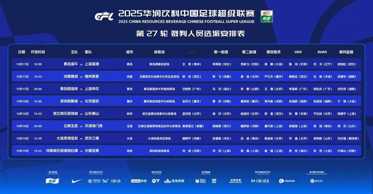 中超官方公布第27轮裁判选派结果,10月18日19:35中超第27轮,状态火热