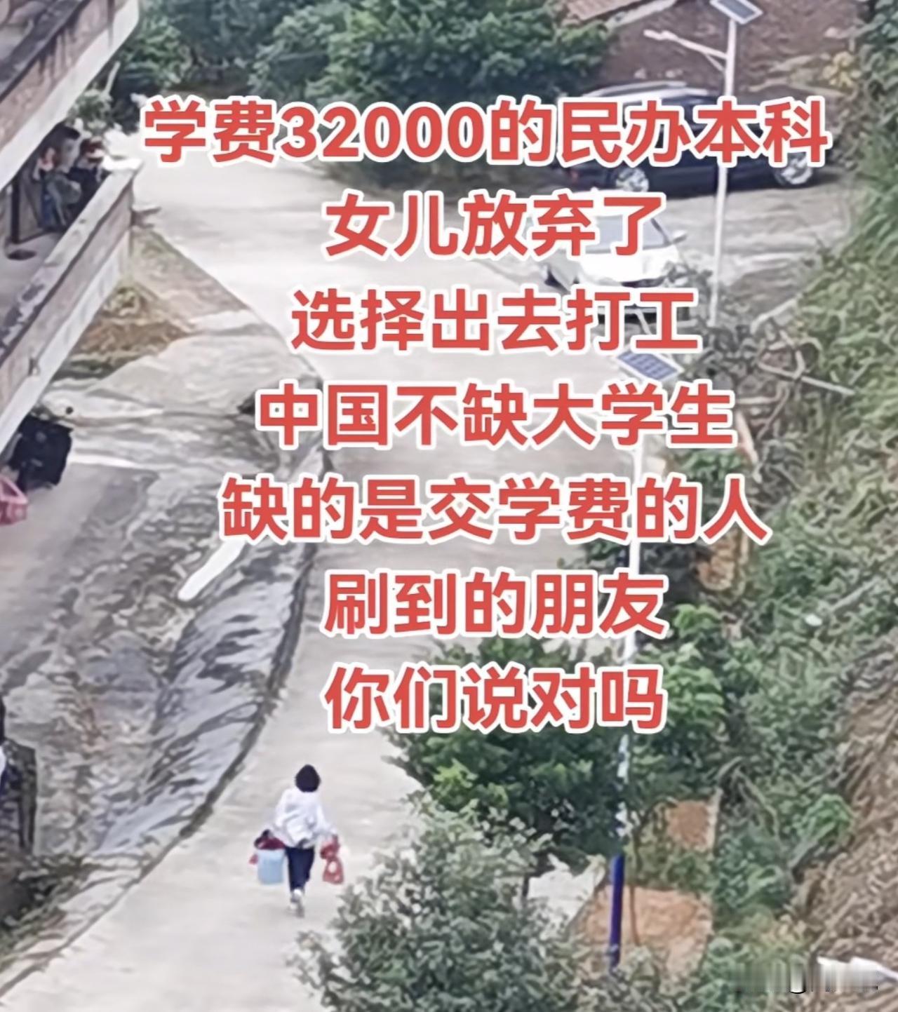 “离谱啊!”刷到一个短视频,这位博主说学费32000元的民办本科,女儿放弃了,选择出去打工。同时,这位博主还表示中国不缺大学生,缺的是交学费的人。 此话一出,引发众多网友热议。有网友感慨道,我儿子学费23000,我的工资6500,硬扛了这3年,还有1年实在是快扛不住了! 也有网友表示,一样压力大,开学才4年级,学费32000、加其它兴趣班,杂七杂八,一年4万7左右,不包括回家其它费用,现在培养一个孩子,太难了。 更还有网友说,我家的学费一年两万五,去年毕业的,四年花了20万就拿了个本科毕业证,现在出来打工一年多了,月月月光族。 那么问题来了,放弃32000元的民办本科,选择出去打工,大家说这个选择对吗?#寻美三湘# #长沙新朋友#