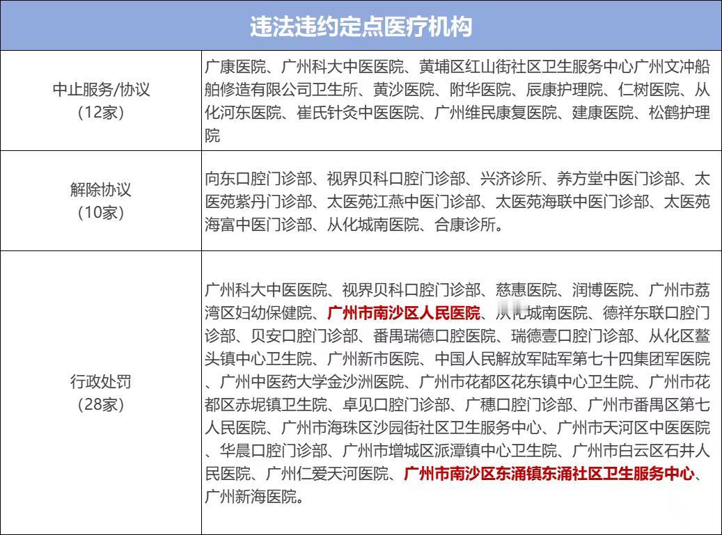 【南沙两家医疗机构医保违法违约被处理】广州市医疗保险服务中心发布了关于2025年第三季度定点机构违法违约行为处理情况的通报。 中心标识经查实,部分定点医疗机构存在降低入院标准收治病例、未按规定办理重大信息变更、违反卫生健康行政部门相关规定使用无执业资质人员开展医疗服务并将相关费用纳入医保基金支付、为非定点医疗机构提供医保结算、年度综合考核结果排名位于住院或单纯门诊定点医疗机构末位5%且考核分数未达总分数60%、伪造医学文书骗取医保基金支出等违约行为受到广州市医疗保险服务中心协议处理;部分定点医疗机构存在虚构医药服务项目骗取医保基金支出等违法行为受到广州市医疗保障局行政处罚。 其中南沙区人民医院(大岗镇那家)、东涌卫生服务中心两家机构被行政处罚!