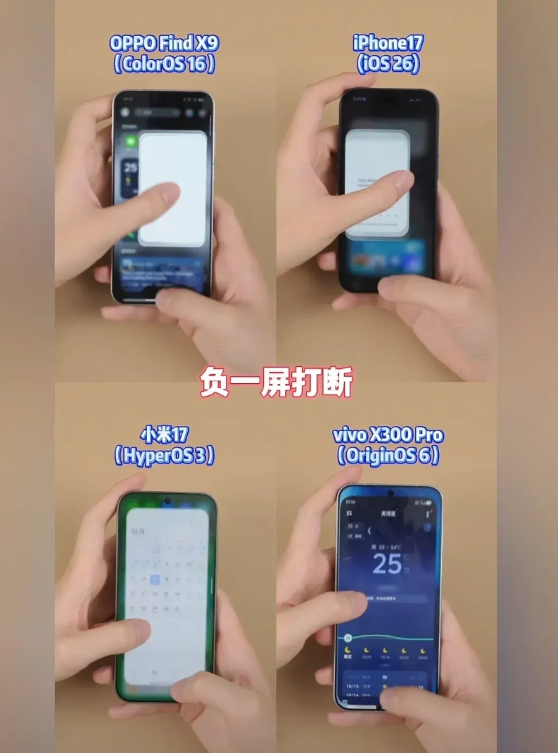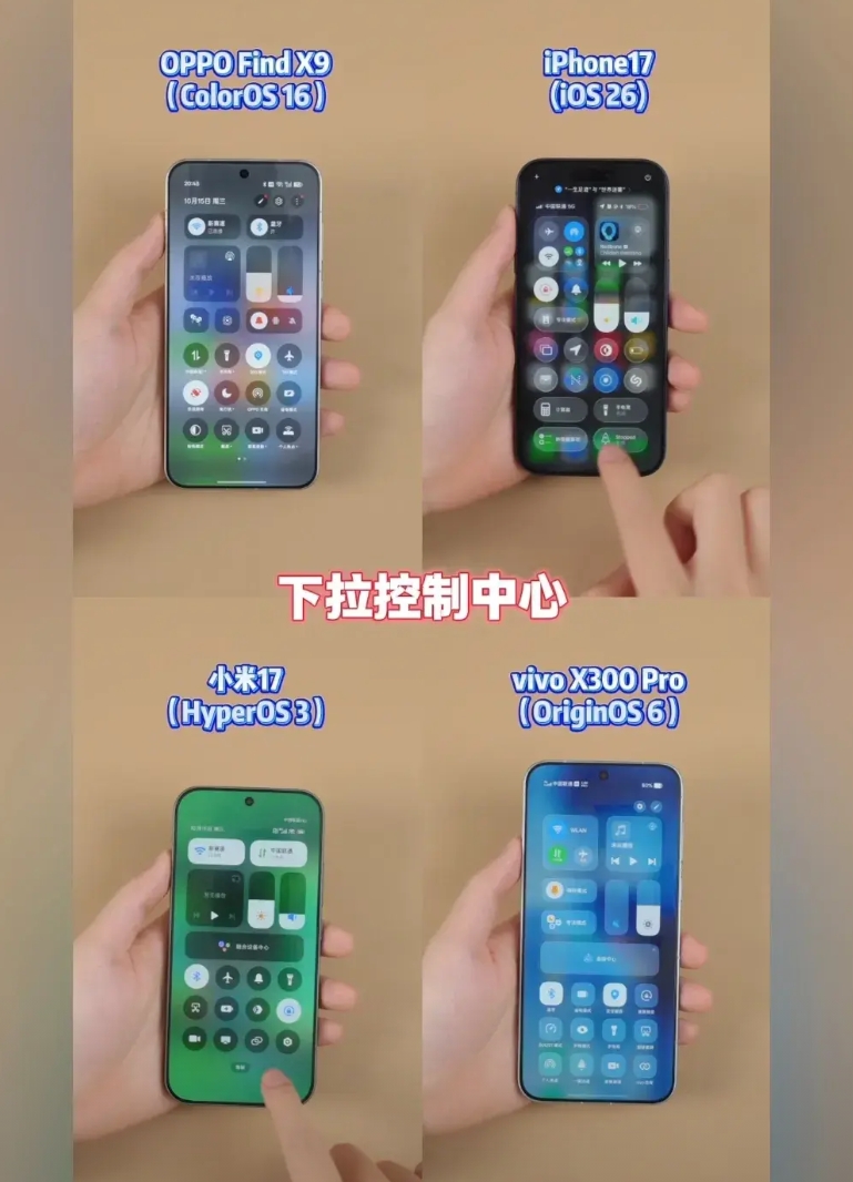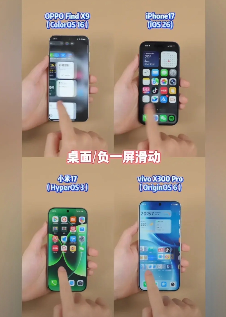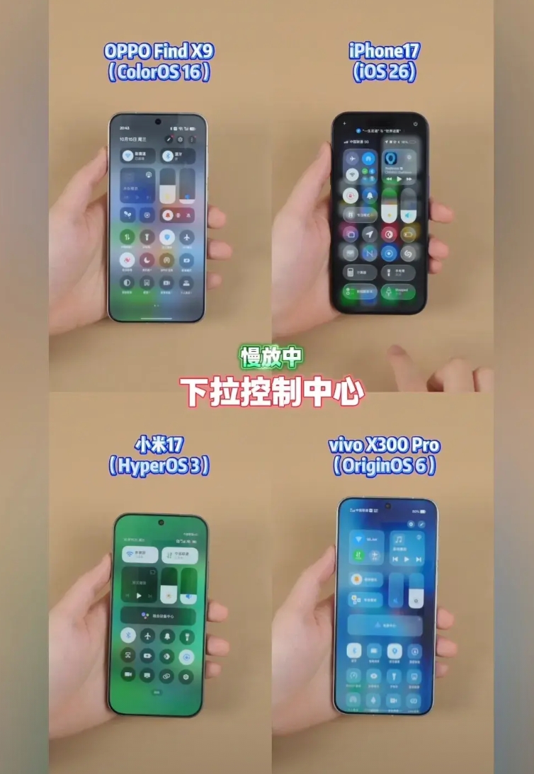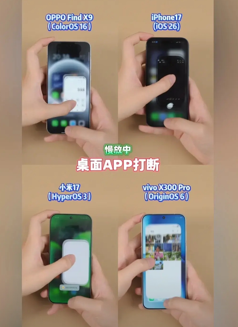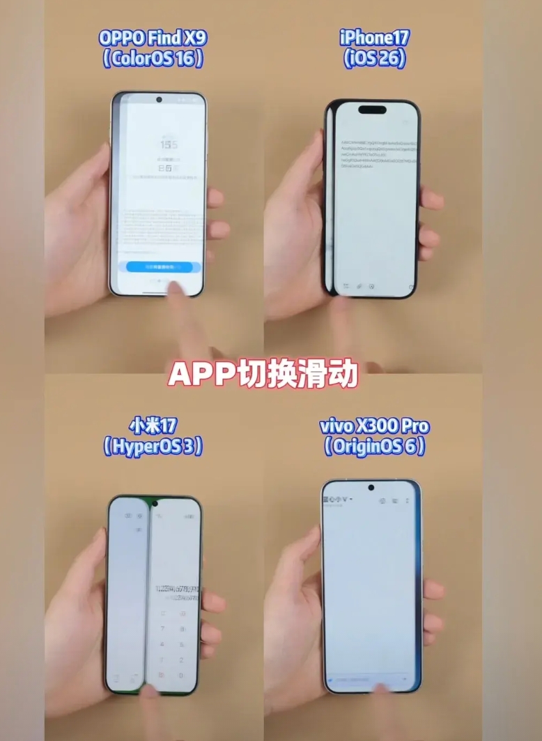 果米OV四大系统流畅度对比,到底谁最流畅? 现在各家手机厂商都在吹自己的系统有多流畅,还不少对标苹果iOS的,那到底谁更流畅?谁在裸游?我们直接上实测对比各家新一代系统——苹果iOS26、vivo OriginOS6、小米澎湃3、OPPO ColorOS16四大系统。 APP打断动画,各家现在已经对这项游刃有余了,都不会有明显的卡顿、掉帧; 负一屏打断动画,这个场景就有人不行了,表现比较好的就是苹果和OPPO,基本前面的应用表现差不多,这个细节没有忽略确实要给好评。 其他小白条应用切换、控制中心下拉动画和主界面滑动对比,即使在0.5倍慢放下,大家的表现都很不错,只是动画的形式有的不一样。 如果要我个人评价,我觉得OPPO的ColorOS16更流畅,机圈德芙是没有吹牛的,而且这次新的灵感主题很好看,小布记忆能自动记账,对于老是爱花钱的穷鬼很友好(比如我)。