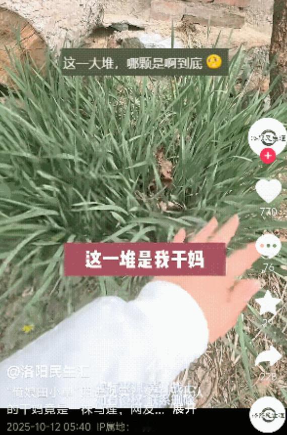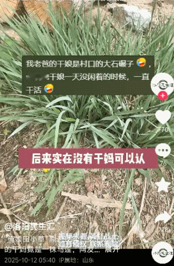 辽宁,一女子指着一堆草大笑说:这是我“干妈”!有网友说:你这没大没小的,就这么扒拉你“干妈”啊…… 10月12号,有位辽宁的女士在社交平台上发布了一个有意思的分享。 她说自己打小就有个“干妈”,但这“干妈”不是咱们平常说的亲戚,而是家门口的一堆马莲草。 为啥会认马莲草当干妈呢? 原来她小时候身体不太好,总往医院跑,爸妈看着急得慌,就想着按老辈的法子给孩子认个干妈,图个保佑,让孩子能少遭点罪,健健康康长大。 可那会儿找来找去,也没找到合适的人,最后没办法,就把家门口那丛长得精神的马莲草当成了干妈。 现在她每次回老家,逢年过节还会特意给这堆马莲草浇浇水,就像走亲戚似的,透着股不一样的亲近劲儿。 像这样认非亲非故的“干妈”“干爹”的习俗,在不少地方都能见到。 有的人家会挑村里年头久、长得粗壮的大树,比如老槐树、老樟树,让孩子认作干爹干妈,觉得大树根深叶茂,能像遮风挡雨一样护着孩子。 有的会选块看着结实的石头,盼着孩子能像石头那样硬朗,少生病。 还有些地方会认当地供奉的神明,比如有网友说自己认的干妈是“白鹤仙娘”,都是图个吉利,想让孩子能顺顺利利长大。 网上好多人看到这个分享,也纷纷说起了自己或身边人类似的经历。 有人说家里孩子的干爹是村口的一口浅水井,后来水井被填了,还难过了好一阵子。 有人小时候差点溺水,是一根树枝救了命,妈妈就带着他拜那根树枝当干爹,后来那根树枝还被家里当成“家法”,孩子不听话时拿出来管教,连后来的孙子都没少被这根“干爹树枝”提醒。 还有人说自己的干妈是个石碾子,小时候每年都要去烧香磕头,那时候还觉得不好意思,后来看到别人也有类似的事,心里才踏实下来。 也有不少让人哭笑不得的事儿。 有名网友说起自己认干亲的过程,可谓是一波三折。 最开始的时候,他的爸爸给他找了一棵大树当干爹,结果第二年“干爹”的叶子就掉得精光,赶紧又找了座小木桥重新认爹,没成想没过多久桥就断了。 最后没辙,直接认了村外的小山坡当干爹,想着这回总不会被“克”了,可几年后赶上修路,小山坡被推平了,一连串的事儿最后让爸爸再也不提为他认干亲。 还有更无奈的,有个村子里有棵几百年的老银杏树,是村子里几代人的“干娘”,后来被移栽到了景区里。 以前住在村里的时候,过年过节去拜干爹很方便,现在倒好,每次去还得先买景区门票,不然连跟“干娘”说句话的机会都没有。 不过话说回来,不管是认马莲草、大树,还是石头、水井,背后都是长辈对孩子满满的牵挂,想让孩子能平平安安长大。 不知道你的家乡有没有这样的习俗?要是有的话,也不妨说说你们那儿都是怎么认“干爹干妈”的,又有哪些特别的讲究呢?