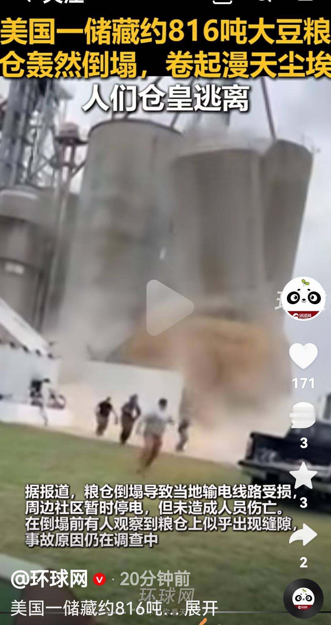 美国大豆储藏室也倒塌了,看来他们储藏也没机会了 根据美国媒体报道,10月15日美国伊利诺伊州一个储藏约860吨大豆的粮仓突然倒塌,大豆喷涌而出,卷起漫天灰尘,周围人迅速撤离 粮仓导弹都是当地输电线路受损附近社区居民停电,未造成人员伤亡 事故原因正在调查中 看里美国大豆卖不出去,这储藏也是问题,真是屋漏偏逢连夜雨美国大豆出口 美国大豆种植户 中美大豆 全球大豆产量 图片来自环球网视频