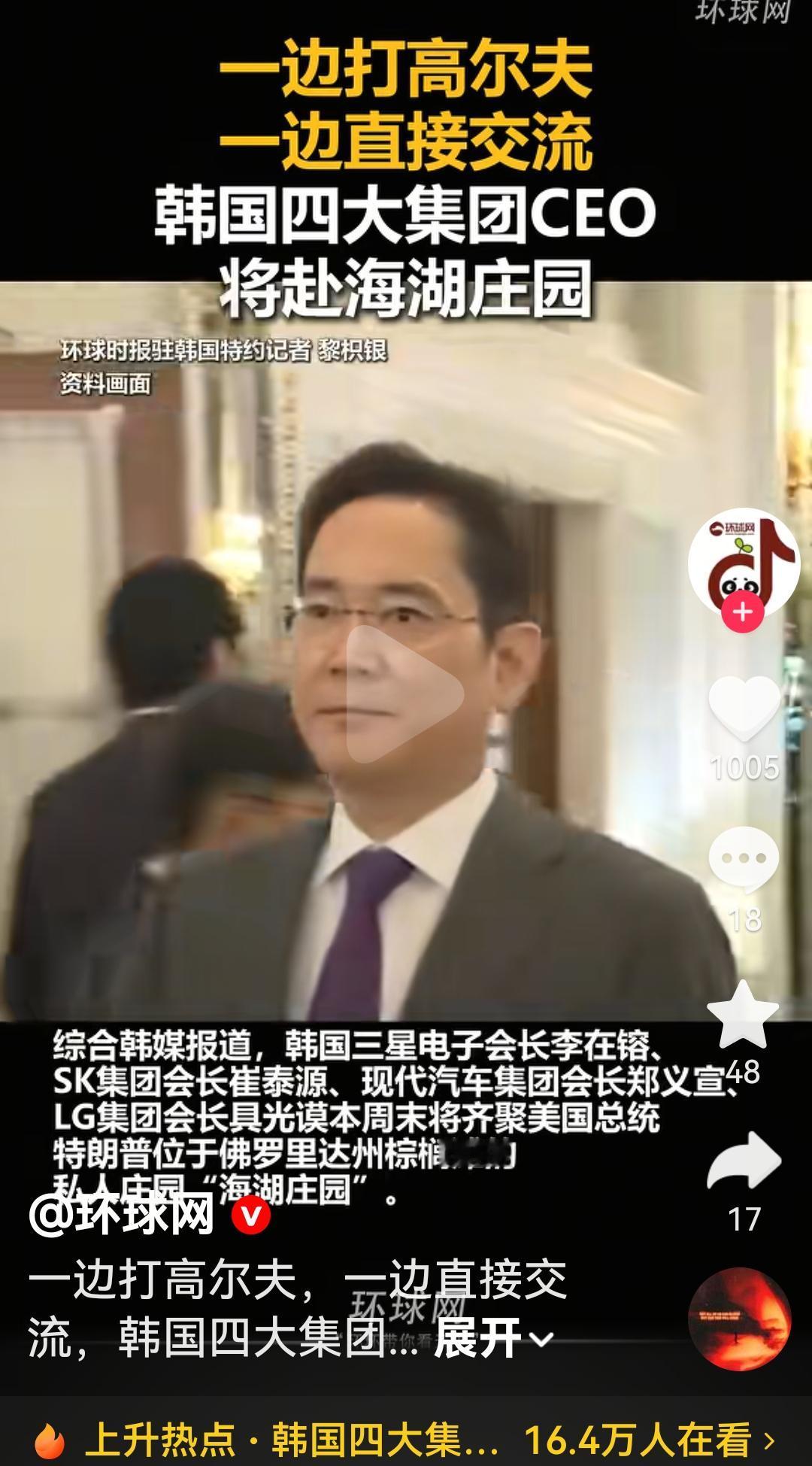 韩国四大财阀CEO去美国特朗普海湖庄园吃饭去了 根据韩国媒体报道,韩国三星老总李在镕,SK集团老总崔泰源,现代汽车集团老总郑义宣,LG集团老总具光谟本周末将齐聚美国总统特朗普位于佛罗里达州私人庄园海湖庄园集会 这是韩国四大集团掌门人首次同时访问此处 也是韩国和美国贸易谈判之后以及9月份韩国工人在美国被抓后,韩国对美国投资担忧的一个吹风会 这次会议由日本软银集团孙正义主持,他正推动和美国企业OPenAi,甲骨文公司共同投资5000亿美元建设AI基础设施以及半导体等领域合作 同时特朗普也将和韩国四大集团掌门人一边打高尔夫一边交流 看来特朗普的军费都有了,去的每个企业家掏点钱这么多企业家明年一年美军工资都有了李在明访美 特朗普怒怼韩国 韩国内部 图片来自环球网视频