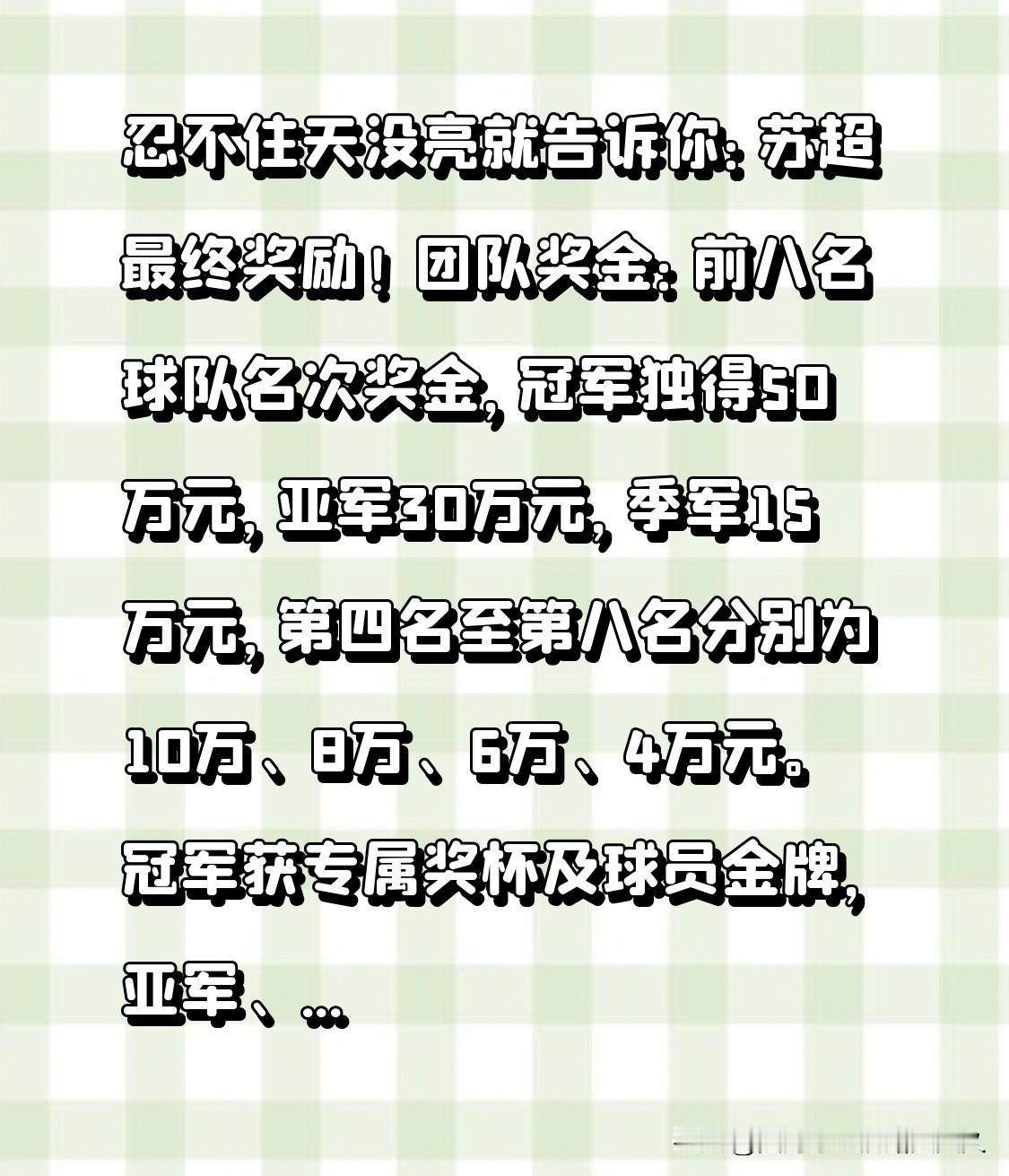 苏超最终奖励! 团队奖金:前八名球队名次奖金,冠军独得50万元,亚军30万元,