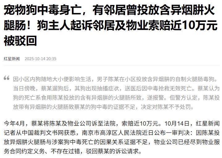 江苏南京,男子嫌小区里的狗总是随地乱尿,他难忍异味,就把带有含异烟肼的火腿肠投放在了小区里,没想到,一泰迪犬当晚中招,食用火腿肠后中毒死亡了,狗主痛失爱犬后悲伤不已,直接把投毒男子和物业告上法庭,索赔狗狗治疗费、火化费,以及精神损失费近10万,然而,法院判决让狗主傻眼。 老陈(化名)住在小区92栋,自己室外有一片小院子,旁边就是单元门。 他每天开门下楼,总能看见有人遛狗不牵绳。 那几只狗不是在草坪里刨土,就是在单元门口撒尿。 天热的时候,味道一股子冲人,尤其一开门,整层楼都能闻到。 老陈一开始还忍着,想着邻里之间别闹得太僵,就去找过几次物业。 物业倒也回应,说会提醒业主注意,还在公告栏贴了几张“养狗人士注意,你的狗在连廊乱撒尿,异味已影响本人,将在91、92、93、94栋连廊附近不定期投放带有异烟肼火腿肠,遛狗到别处去,否则后果自负。”的告示。 可几天过去,情况一点没变,告示被风吹得卷边,狗照样满地乱跑,尿味反倒更浓。 那天晚上,老陈坐在阳台上乘凉,看着楼下草坪,又看见一只小白狗跑过去,对着花坛一阵撒尿,主人站在旁边玩手机,连头都没抬。 他心里那口气一下子就上来了。 他越想越气,脑子里忽然冒出前阵子在网上看到的一条帖子,说有人用“异烟肼”吓唬遛狗不牵绳的主人。 3月8号下午,他买了火腿肠和药片,把异烟肼塞进去,用绳子捆好做了六段,悄悄放在小区草坪边上。 当天傍晚,蔡先生(化名)照常牵着“可乐”出去散步。 那天风挺大,狗绳虽然系着,但“可乐”没戴嘴套,走到92栋那片草丛边时,突然钻进去闻来闻去。 蔡先生没太在意,只是喊了两声让它出来。 可回家没多久,“可乐”就开始不对劲了,先是趴在角落里不动,接着开始抽搐、流口水。 蔡先生吓坏了,连夜送去宠物医院。医生检查后说是疑似中毒,要马上洗胃、打针。 蔡先生几乎没睡,一连几天守在医院里,花了四万多块。可折腾了一个多月,“可乐”还是没挺过去,4月24号死在了宠物医院。 那天他抱着狗的骨灰盒,一句话都说不出来。 10年的陪伴,说没就没了。 他想起小区群里的“投毒警告”,立刻报了警。 警方调监控后,确实看到老陈那天在草坪附近活动,还在现场找到了剩下的火腿肠。 可让人意外的是,5月12号出来的处理结果写着:“证据不足,不予处罚。”理由是,无法确定“可乐”吃下的,就是老陈放的那几根毒肠。 今年4月,他一咬牙,把老陈和物业一起告上法院,要求赔偿治疗费、火化费、狗的价值和精神损失费,总共近十万元。 他说,这不是钱的问题,而是要个公道。 法院认为,虽然老陈确实承认投放过毒火腿肠,但蔡先生也自己承认,当天遛狗走了好几处,绕了湖边、草地、步道,都可能是狗误食的地方。 没有确凿证据证明“可乐”的死亡,就是老陈造成的。 至于物业,法院查明他们日常有巡查、有宣传,也及时配合警方调监控,已经尽到了责任,不存在失职。 最终判决,驳回蔡先生的全部诉求。 判决一出,小区炸开了锅。 有人替蔡先生不平,说养了十年的狗就这么没了,太冤。 也有人认为老陈确实该受惩罚,“就算狗没吃他放的毒,他敢干这事,本身就没人味儿。” 现在的蔡先生,提起这事还是红着眼圈:“不是钱,我就是想问问,这样的事,到底谁管?” 小区物业后来加装了“文明养犬”提示牌,还放了宠物粪便袋的收纳箱,算是给大家提个醒。 其实,这事说到底,是两边都没处理好。 养狗的人要管好自家宠物,出门拴绳戴嘴套、清理粪便。 讨厌狗的人,也不能用极端的方式发泄。 投毒这种事,不光可能害到狗,要是误伤到孩子或者其他人,那性质就完全变了。 一条狗没了,两个邻居闹掰,小区的气氛也变得紧张。 有时候,冷静一点、互相让一步,也许比上法庭更能解决问题。 对此你怎么看? 信源:红星新闻