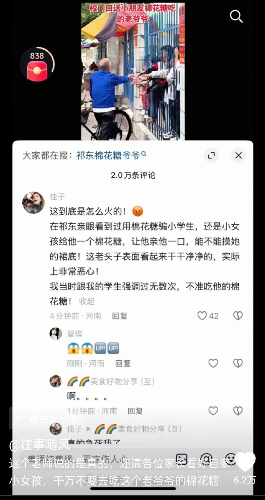 最近火一个祁东棉花糖爷爷,在学校门口踩棉花糖,一边踩,一边送学生,学生围着他都甜甜得喊着爷爷。 但是评论区就开始有人说那个爷爷以棉花糖为诱饵,实行猥亵之事,说的有榜有眼的。 我作为旁观者,我相信这个爷爷是善举,虽然用手拿吃的不干净,但是抵挡不住美食的诱惑,爷爷的善心,孩子也开心。 但是作为家长,尤其是女孩子的家长,我会选择相信评论区的话,因为我不敢拿孩子的安全做赌注,赌人性的好坏,赌输了,啥都没有了。