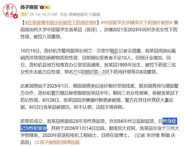 在美读博中国小伙被控下药鸡奸罪 “终身登记为性犯罪者”,我们国内的法律,在对性犯罪者判决时,可以把这一条学过来,性犯罪者的征信系统中要终身登记[怒][怒]