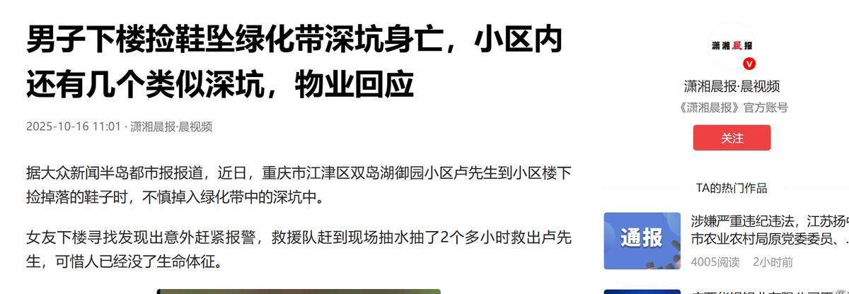 10月16日报道,重庆江津,卢先生弯腰去捡掉在楼下的鞋子,谁也没想到,成了他与家人的永别,他脚下踩的不是结实的地面,而是一个伪装成绿化带的深坑,五六米深,坑口只用几根钢筋和木条撑着,上面盖着彩条布和泥土。 10 月 16 日,重庆江津的一则报道让人看完心里堵得慌,二十多岁的卢先生,就因为弯腰去捡掉在楼下的一只鞋,再也没能回到家人身边,谁能想到平日里天天经过、看着再普通不过的一片绿化带,底下竟藏着个能致命的深坑,这一个寻常的弯腰动作,成了他和家人的永别。 那天估计就是个再平常不过的日子,卢先生在家发现鞋子不小心掉在了居民楼外墙边的空地上,想着下楼顺手捡回来就行,这么点小事,换谁都不会多琢磨。 他穿着家常的衣服下楼,走到那片熟悉的区域,那地方看着就是普通的绿化带,草皮长得跟周围的植被没两样,泥土也铺得平平的,连个凸起或凹陷都没有,完全看不出任何异常。 他走到鞋子旁边弯腰伸手去够的瞬间,脚下突然传来 “咔嚓” 一声轻响,还没等他反应过来,整个人就往下坠,原来他踩的根本不是结实的地面,而是一层精心伪装的 “壳”。 那底下是个五六米深的深坑,坑口不算特别大,但足够一个成年人掉进去,支撑着上面那层 “地面” 的,就只有几根细细的钢筋和松松垮垮的木条,上面铺了层廉价的彩条布,再盖了层薄泥土和草皮,乍一看跟真的绿化带没区别,可根本经不住一点重量,卢先生一踩上去,这层伪装瞬间就塌了。 更要命的是深坑底下还积着水,坠落的冲击力加上溺水的危险,让卢先生连自救的机会都很渺茫。等邻居们听到动静赶过来,只看到一个黑漆漆的坑口,赶紧报警求救,可等救援人员把人救上来时,卢先生已经没了生命体征。 好好的一个人就因为一只鞋、一片看似安全的 “绿化带”,突然就没了,他的家人赶到现场时,哭得几乎站不住,那种悲痛,任谁看了都心疼。 后来大家才慢慢摸清这个坑的来路,开发商的工程图纸上,压根就没有这个坑的记录,没人知道当初是谁挖的,是为了施工临时挖的土坑,还是有其他用途,又为啥挖了之后不填上,反而用这么简陋的方式伪装起来,小区物业也一脸无辜,说日常巡查从来没发现过这个隐患,仿佛这个坑是凭空冒出来的。 更让人后怕的是,事后有关部门在小区里排查,又找出了好几个类似的隐患点,有的是没填实的管道沟,有的是废弃的施工坑,都藏在不起眼的角落,靠着简单的伪装糊弄人。 这哪是什么偶然的意外啊,分明是小区管理出了大漏洞,责任在开发商、物业的交接和日常维护里被推来推去,最后酿成了这样的悲剧。 小区里的邻居们得知真相后都慌了神,平时大家进出都要经过那片区域,老人早上会在楼下散步,小孩放学了会在附近玩耍,现在想想都后背发凉,万一掉下去的是老人或者孩子,后果同样不堪设想。 网上好多人讨论这事,有人说 “这跟故意设陷阱有啥区别?”,这话听着扎心,却说出了大家的真实感受:连家门口的路都变得不踏实了,那种脚下随时可能踏空的焦虑,在整个小区里蔓延开来。 现在那深坑边已经拉上了红色的警戒线,还有人 24 小时守着,生怕再出意外,可这些措施都是用一条年轻的生命换来的,填几个物理上的坑容易,找工人把土填上、把隐患清掉就行,可那些藏在管理里的漏洞,却没那么好补图纸上的缺失、巡查的疏忽、责任的推诿,这些问题不解决,大家心里的 “坑” 就永远填不上。 (信息来源:潇湘晨报——男子下楼捡鞋坠绿化带深坑身亡,小区内还有几个类似深坑,物业回应)